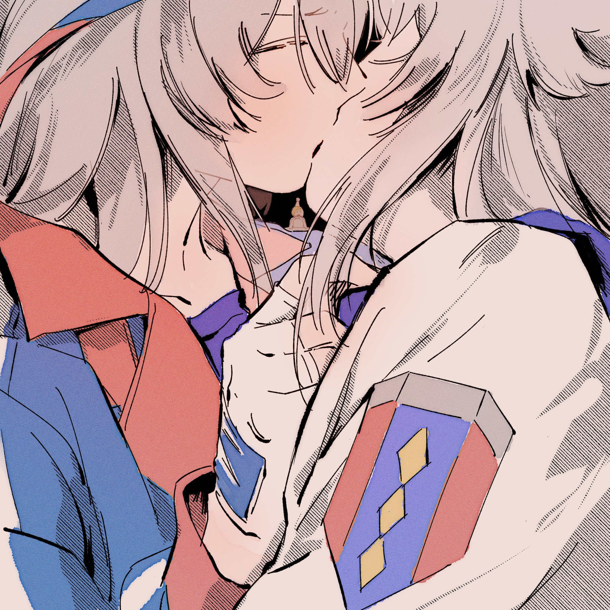 2girlsblue hairbandblue jacketblue sailor collarblushclosed eyesclosed mouthfingerless glovesglovesgrey hairhairbandheadbandhorse girljacketkisslong hairlong sleevesmultiple girlsnooctadesured headbandsailor collarstriped clothesstriped hairbandupper bodywhite gloveswhite jacketyuri