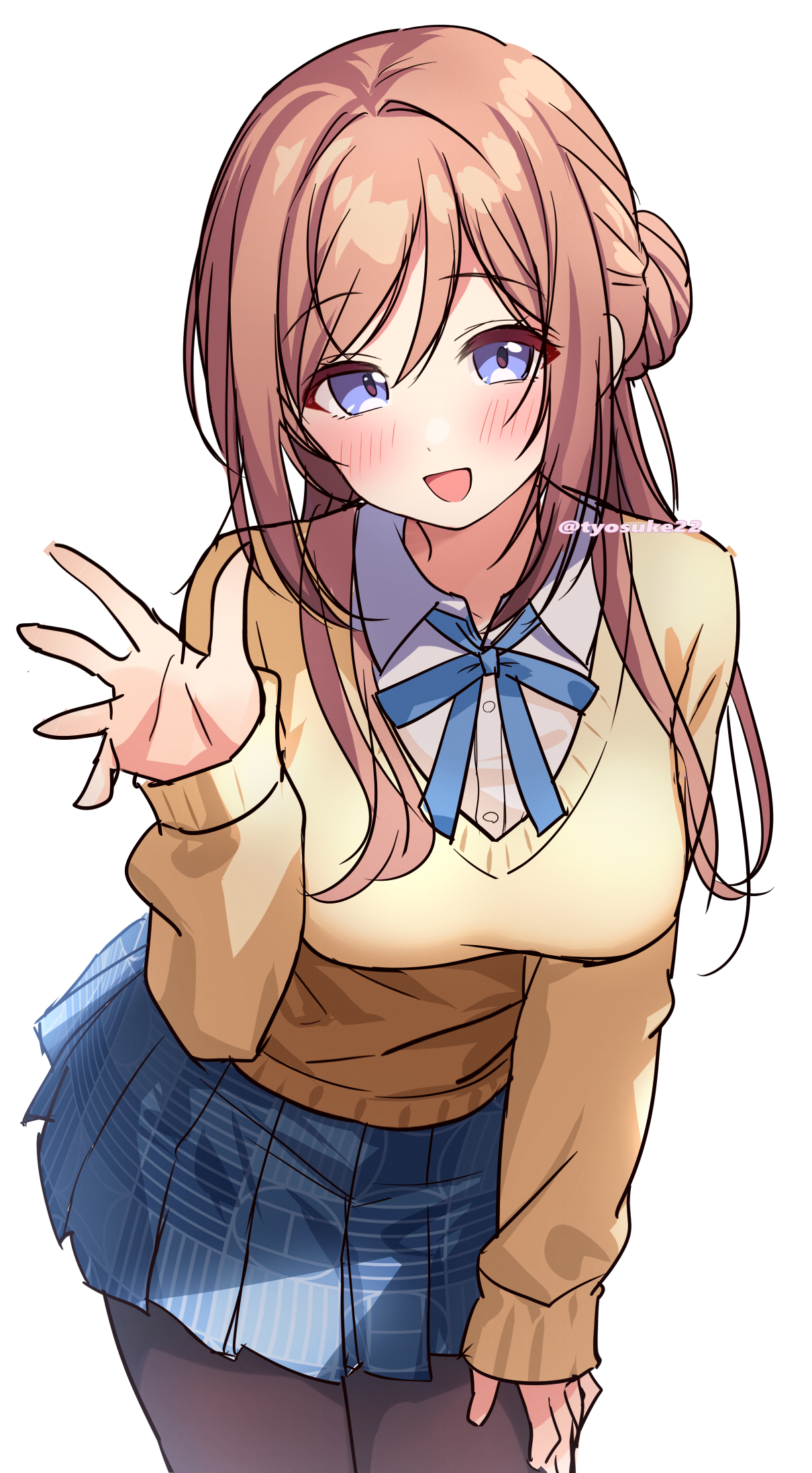 1girlblue eyesblue ribbonblue skirtblushbreastsbrown hairbrown pantyhosehair bunhand upleaning forwardlong hairlong sleeveslooking at viewermedium breastsneck ribbonopen mouthpantyhosepleated skirtribbonschool uniformshirtsimple backgroundsingle side bunskirtsmilesolosweatertwitter usernamewhite backgroundwhite shirtyellow sweater
