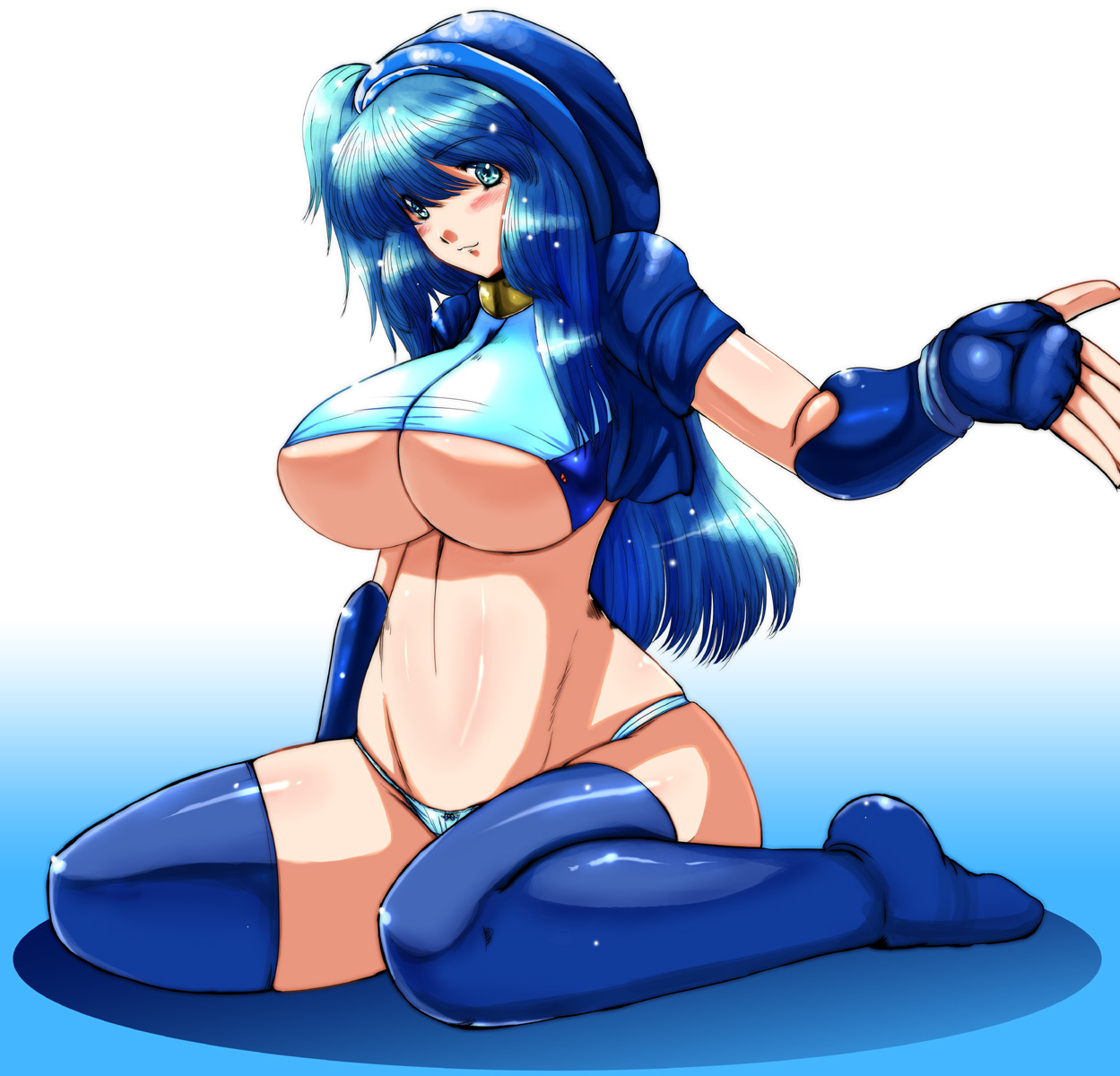 :3blue eyesblue hairblushbreastsfingerless glovesgloveship focushuge breastskneelingmidriffpantiessolothighhighsunderboobunderwearwide hips