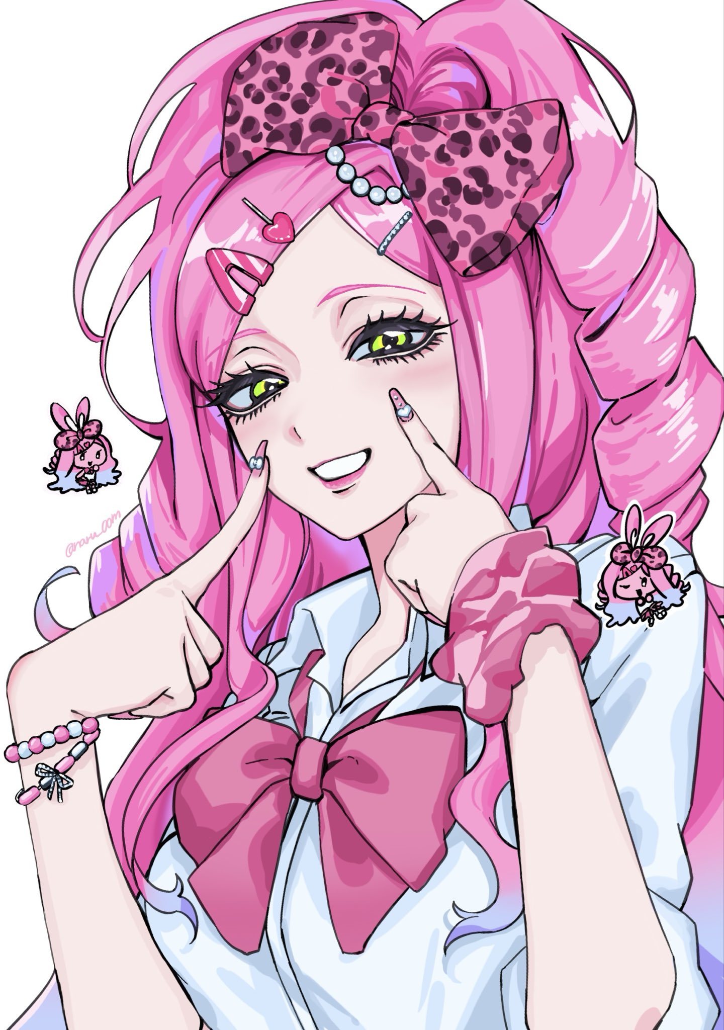 1girlalternate costumeanimal earsanimal printbead braceletbeadsbowbowtiebraceletcollared shirtfingernailsfingers to cheeksgyaruhair bowhair ornamenthairclipheartheart hair ornamentjewelryleopard printlong fingernailslong hairlooking at viewernaru 00mpink bowpink bowtiepink hairpink lipspink nailspink scrunchieportraitrabbit earsringletsscrunchieshirtsignaturesimple backgroundsmilesolowhite backgroundwhite shirtwrist scrunchieyellow eyes