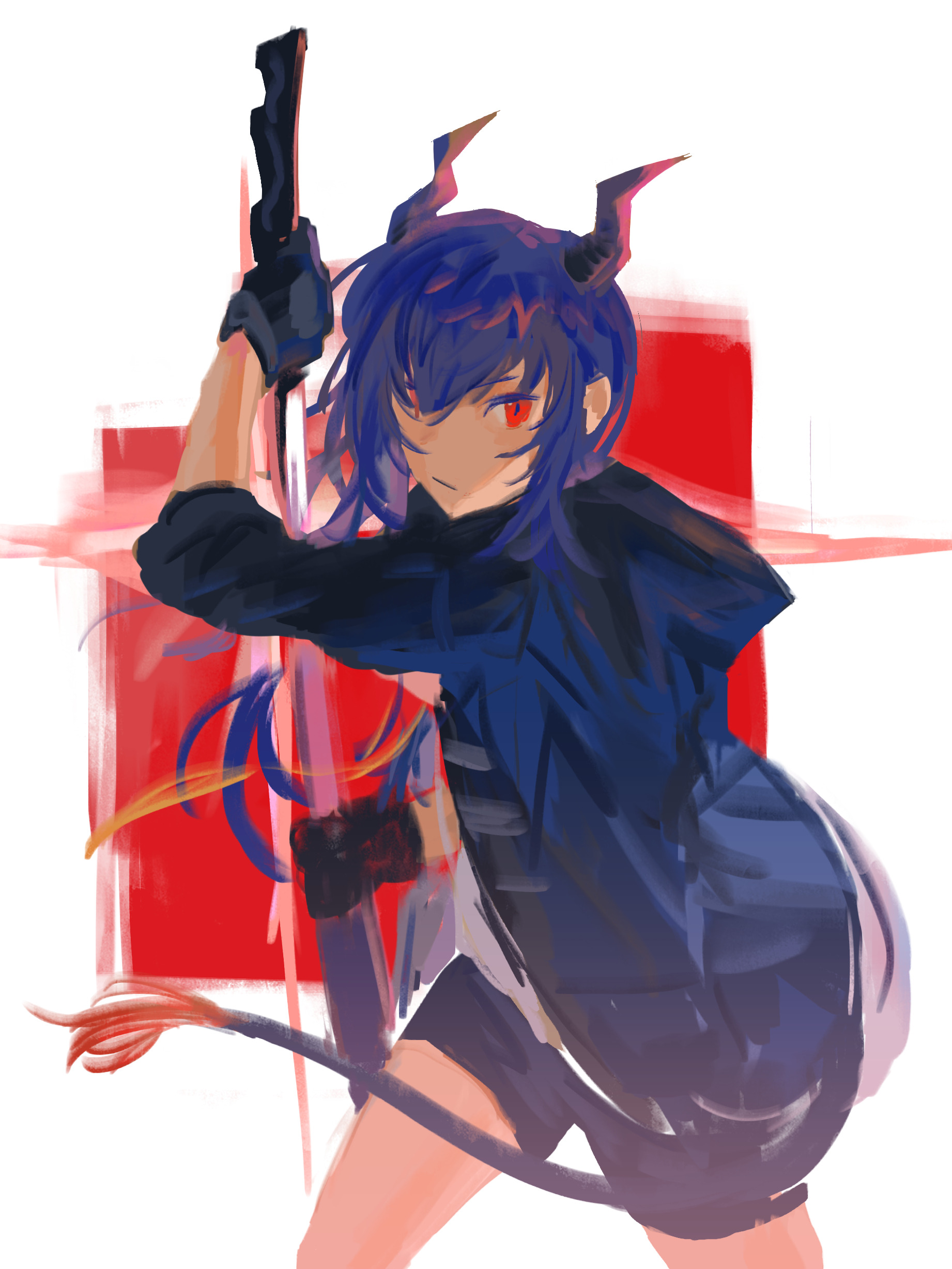 1girlblack glovesblue hairblue jacketblue shortsclosed mouthcowboy shotdragon girldragon hornsdragon tailgloveshair between eyesholdingholding swordholding weaponhornsjacketleaning forwardlong hairnecktieorange necktiered eyesshirtshortssidelocksswordtailweaponwhite shirt