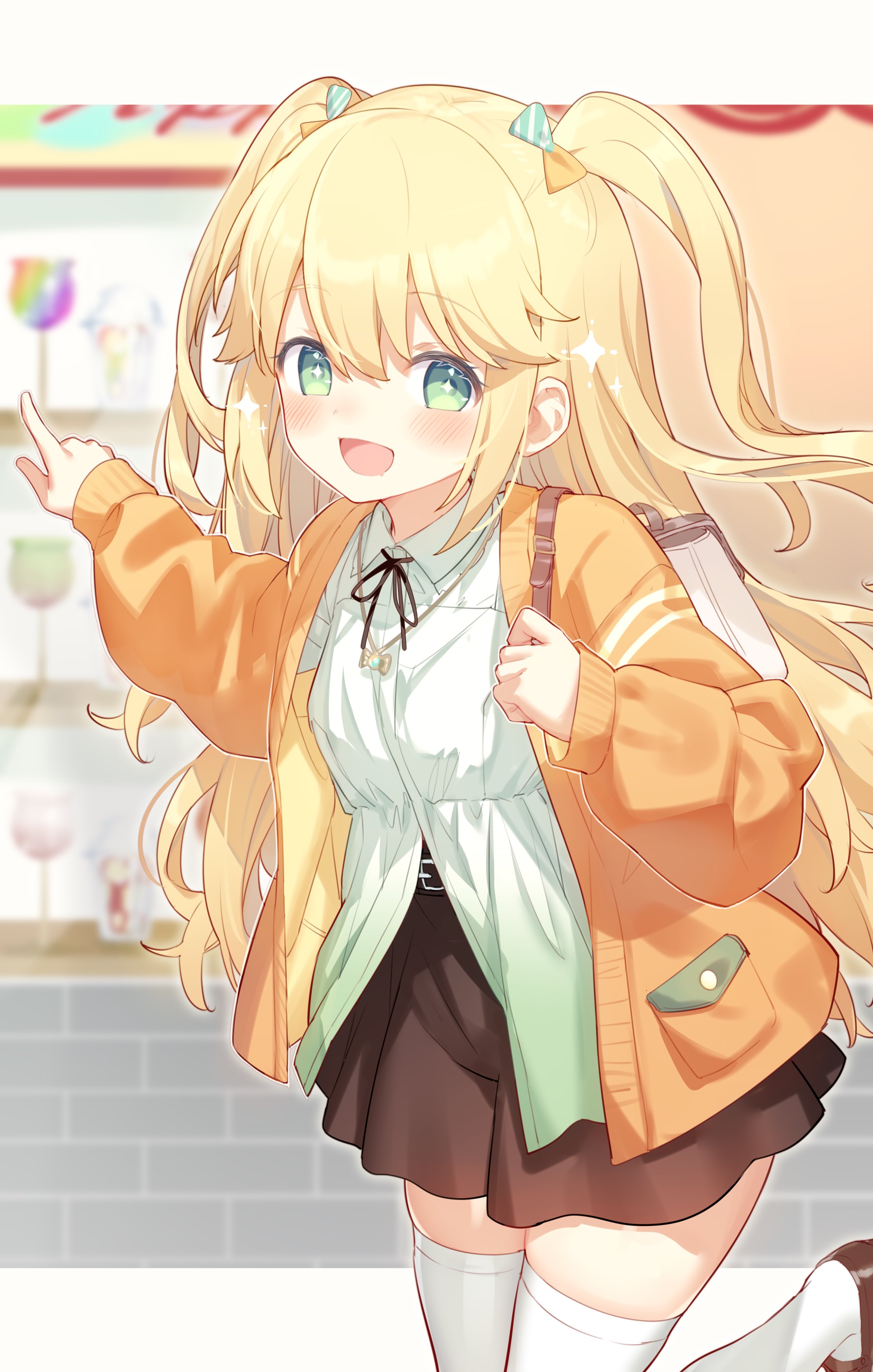 :d1boy1girlbackpackbagblack ribbonblonde hairblushbowbrown shoesbrown skirtcardigancollared shirtcowboy shotgreen eyeshair bowlong hairlong sleeveslooking at viewerneck ribbonopen cardiganopen clothesopen mouthorange cardiganpointingribbonshirtshoesskirtsmilesolothighhighstwo side upwhite shirtwhite thighhighszettai ryouiki