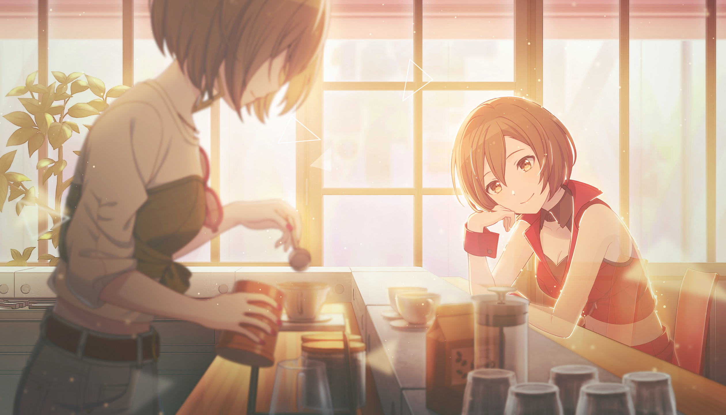 2girlsbeltblack beltblue pantsbreastsbrown eyesbrown haircleavageclosed mouthcropped jacketcupdual personafingernailshair between eyesholdingjacketkimi to sekai no hajimari de (project sekai)large breastslooking at viewermultiple girlsnail polishpantsplantred jacketred nailsred wrist cuffsred-framed eyewearsaucershirtshort hairsittingsmilesunglassestriangleunworn eyewearwhite shirtwrist cuffs