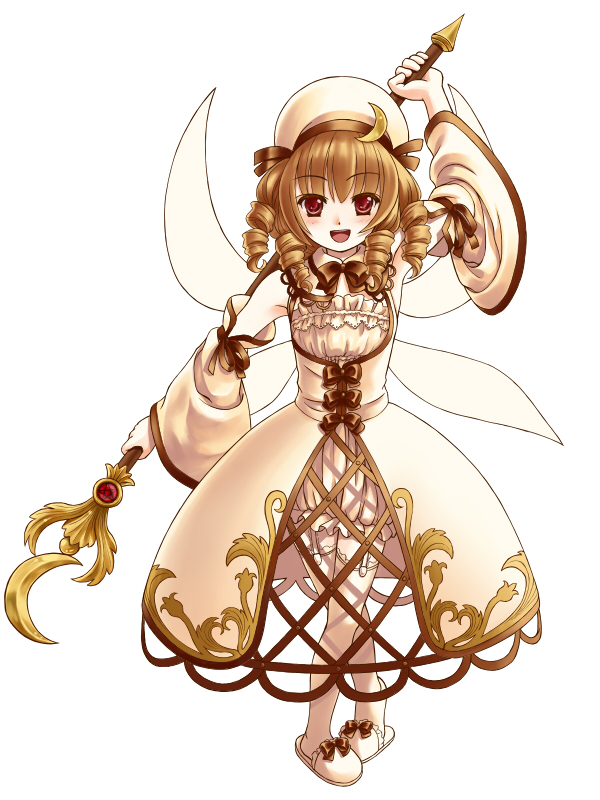 1girladapted costumealternate costumearmpitsberetblonde hairbloomersbowbowtiecrescentcrossed legsdetached sleevesdressdrill hairfairy wingsfemale focusgarter beltgarter strapsgownhatmagical girlmoonopen mouthred eyesslipperssmilesolostaffstandingunderwearwatson crosswings