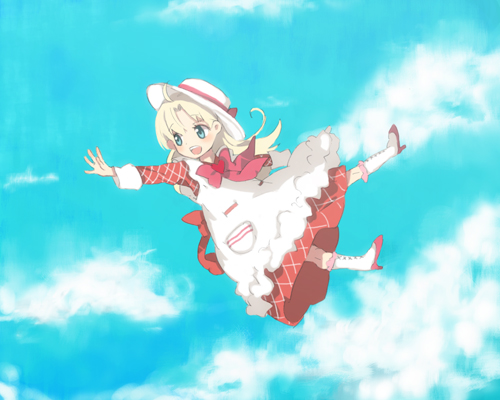 00s1girlapronblonde hairblue eyesbootsbroochclouddressfemale focushappyhatheartheart broochjewelrylong hairoutdoorsporkpie hatribbonskirtskysmilesolo