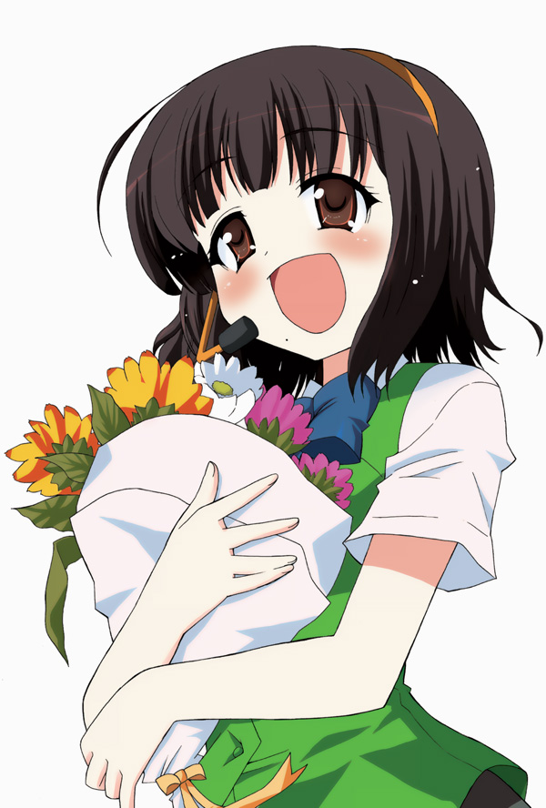 00s1girlblushbouquetbrown eyesbrown hairfemale focusflowerheadsetmolemole under mouthopen mouthshort hairsimple backgroundsmilesolo