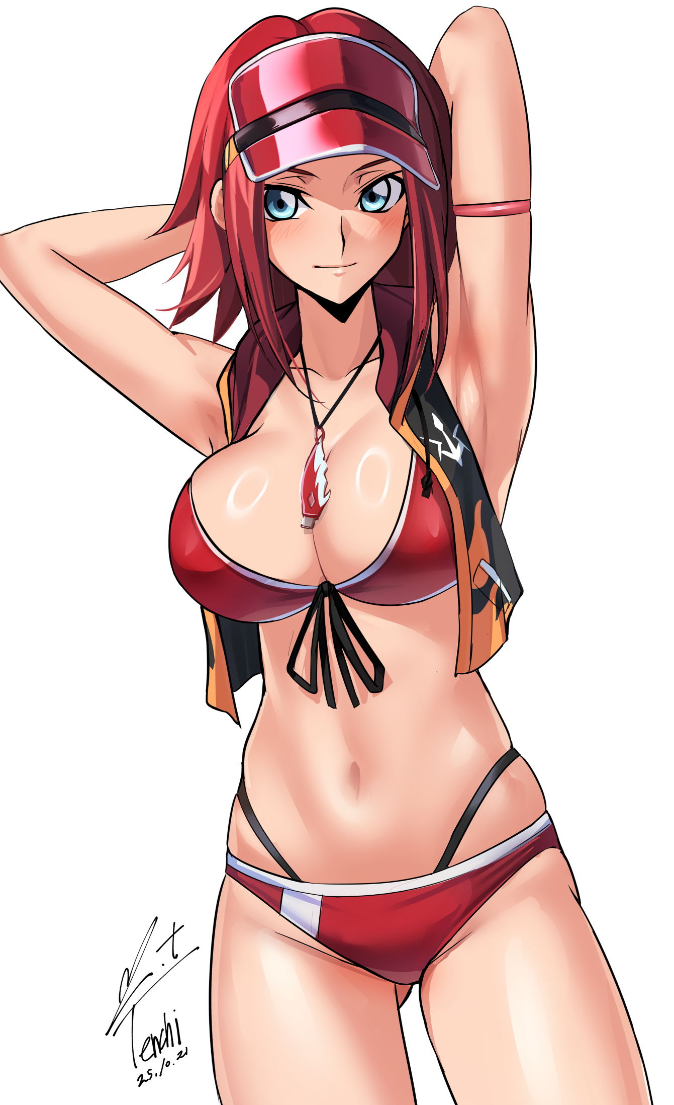 1girlarm behind headarmpitsartist namebikiniblue eyesbreastscleavagedatedjacketjewelrylarge breastslooking at viewermulticolored jacketnavelnecklacered bikinired hairshort hairsimple backgroundsolostomachswimsuittwo-tone jacketvisor capwhite background