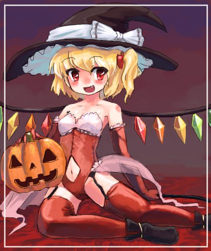 1girlalternate headwearbare shouldersblushclothing cutoutcosplayelbow glovesfangfemale focusflat chestgarter strapsgloveshatjack-o'-lanternkirisame marisa (cosplay)midriffnavelnavel cutoutno noseone side upopen mouthpumpkinred thighhighsshort hairside ponytailsittingsolothighhighswitch hat