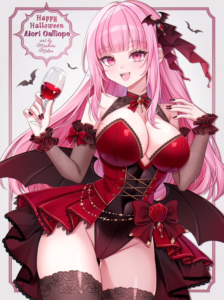 1girlalternate costumeartist namebare shouldersbat (animal)bat wingsblunt bangsbreastscleavagecupenglish textflowerholdingholding cuphuge breastsnail polishpink hairred eyesred flowerred nailsred roserosethighhighsvirtual youtuberwings