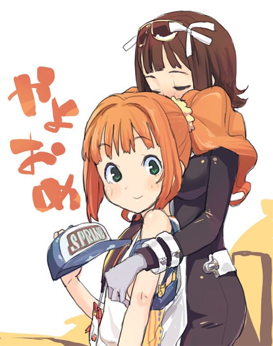 suiyou taruta, kitashirakawa chiyuri, okazaki yumemi, phantasmagoria of dim.dream, touhou, touhou (pc-98), 2girls, anchor, blonde hair, closed eyes, cross, female focus, hat, long hair, midriff, multiple girls, navel, red hair, ribbon, sailor hat, twintails, yellow eyes