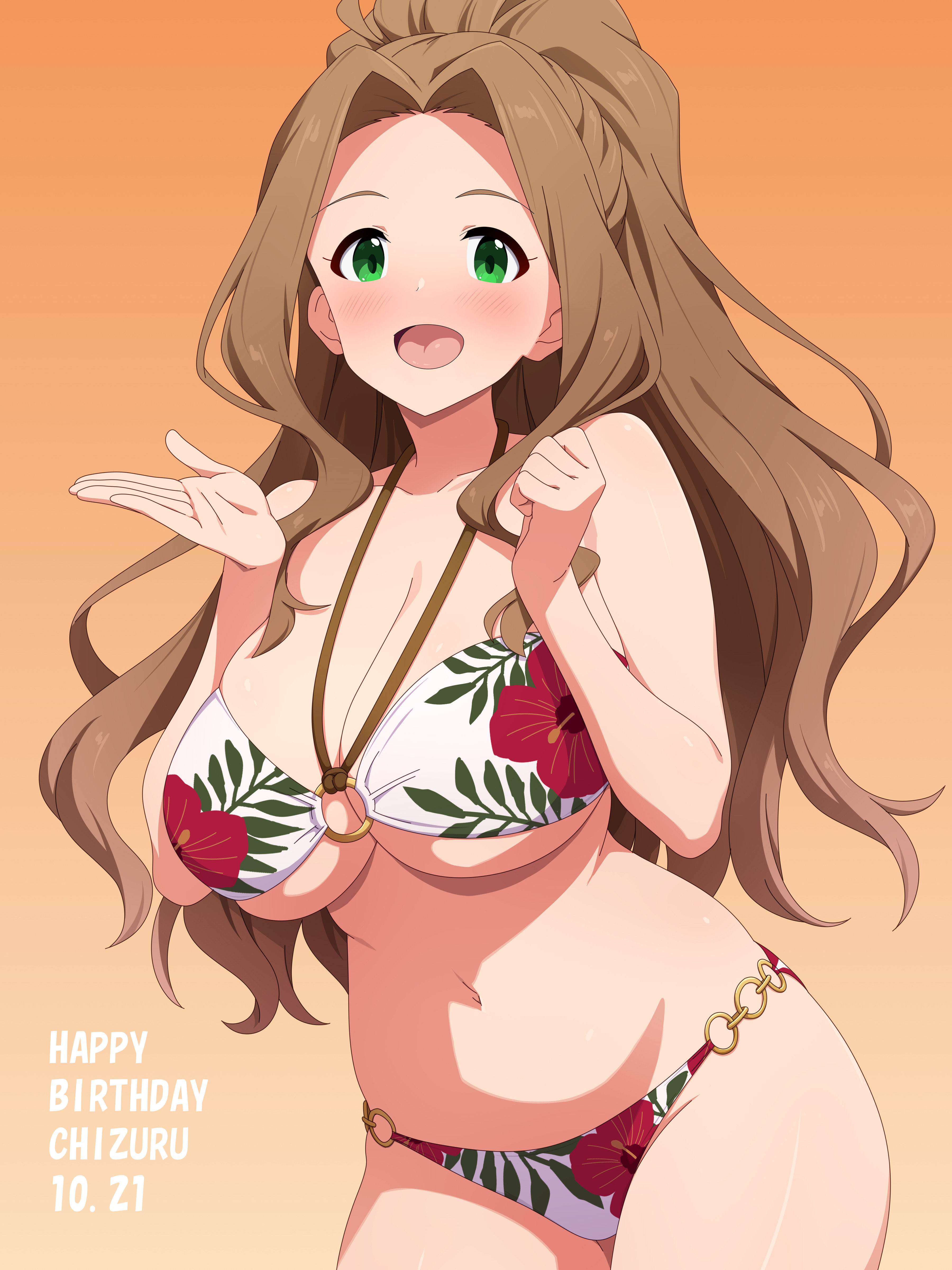 :d1girlbikiniblushbreastsbrown haircleavagecollarbonecowboy shotfloral printfloral print bikinigradient backgroundgreen eyeshappy birthdaylarge breastslong hairnavelo-ringo-ring bikiniopen mouthorange backgroundparted lipsprint bikinisimple backgroundsmilesolostandingswimsuitunderboobvery long hairwhite bikini