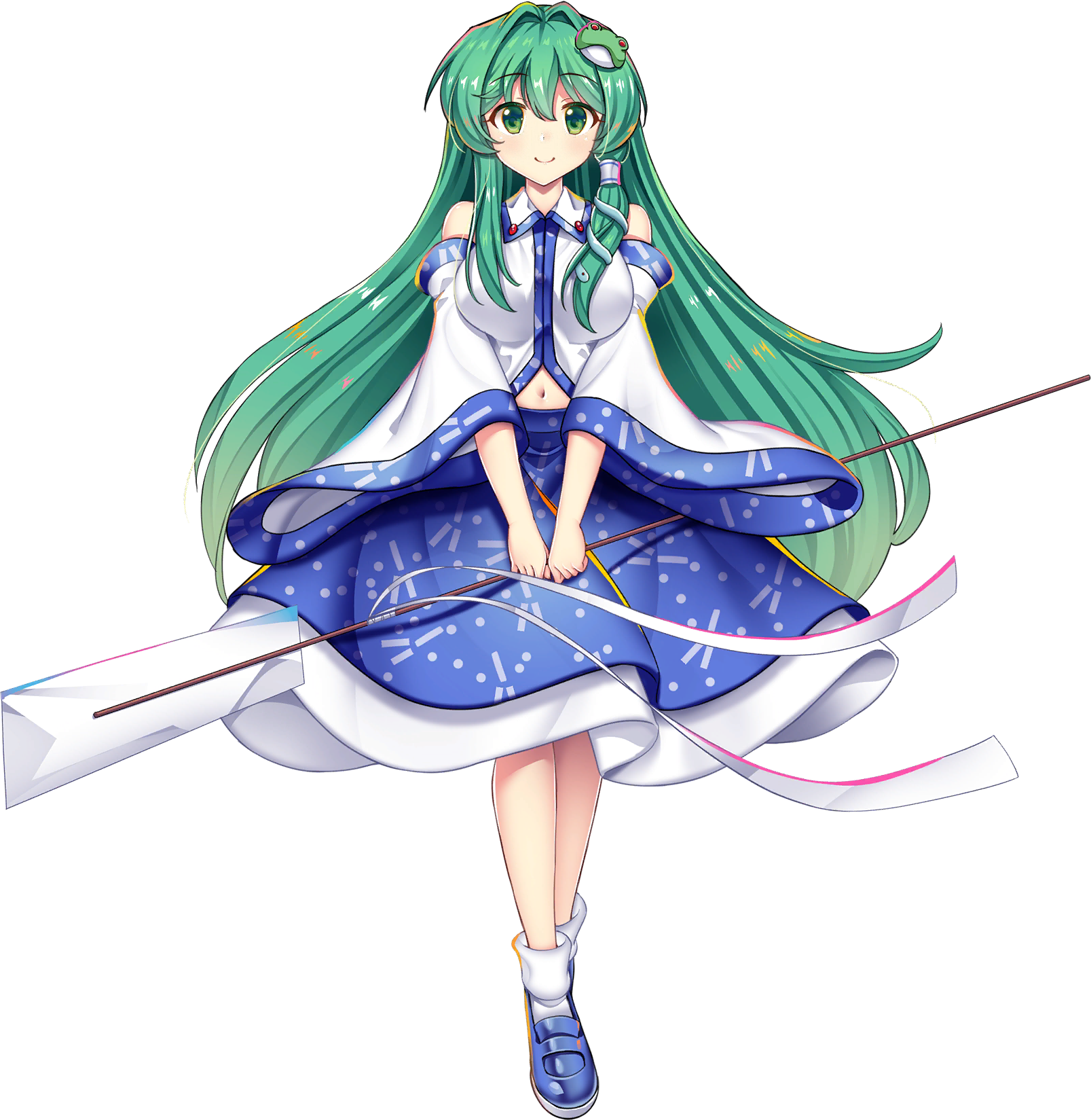 1girlblue shoesblue skirtdetached sleevesfrog hair ornamentfull bodygreen eyesgreen hairhair ornamentholdingholding stafflong hairnontraditional mikoshoessimple backgroundskirtsmilesnake hair ornamentsolostafftachi-ewhite background