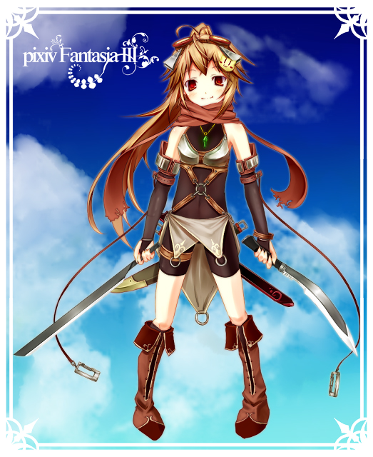 1girlbare shouldersbootsbrown glovesdual wieldingelbow glovesfantasyfemale focusglovesholdingknee bootslooking at viewerorange hairred eyessolotwintails