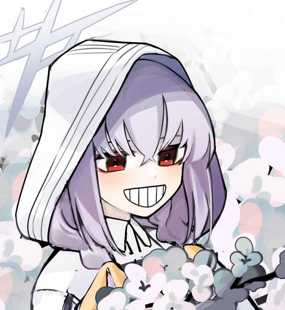 :d1girlatsuko's grin (meme)bouquetclose-upcrossed bangseyebrows hidden by hairfieldflowerflower fieldgrey halogrid teethgrinhair between eyeshair ribbonhaloholdingholding bouquethoodhood upjacketjitomelong hairmemeopen mouthpurple hairribbonsidelockssmilesoloteethupper bodywhite hoodwhite jacketyellow ribbon