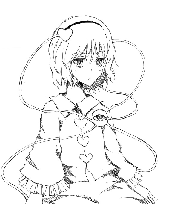 1girlexpressionlesseyeballfemale focusgreyscalehairbandheartjacketlong sleeveslooking at viewermonochromeshort hairsimple backgroundskirtsolowhite background