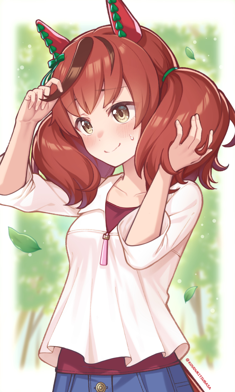 1girlanimal earsblue skirtblushbrown eyesbrown hairclosed mouthdenimdenim skirtear coversfalling leaveshorse earshorse girlleaflong hairred shirtshirtskirtsmilesolosweatthree-quarter sleevestwintailsundershirtupper bodywhite shirtwhite streaks