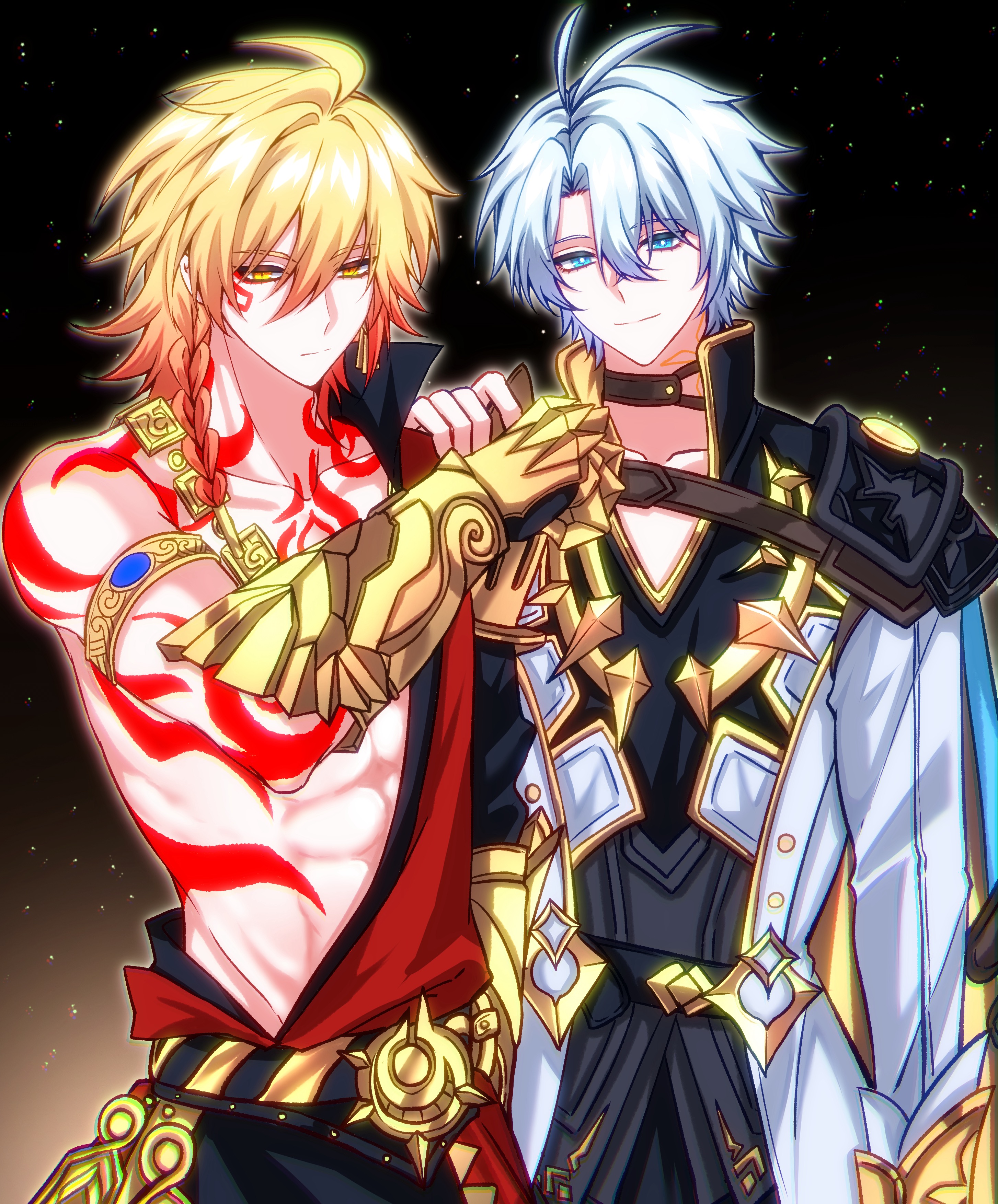 2boys9182611928antenna hairarm tattooarmletarmorblack chokerblack coatblack shirtblonde hairblue capeletblue eyesbraidcapeletchest tattoochokerclawed gauntletscoatearringsfacial tattoogold earringsgold necklacegradient hairjewelrymale focusmedium hairmulticolored hairmultiple boysneck tattoonecklaceopen clothesopen coatparted bangspauldronsred hairred tattooshirtshort hairshoulder armorside braidsingle pauldronsun symbolsun tattootantattoowhite coatwhite hairyellow eyes