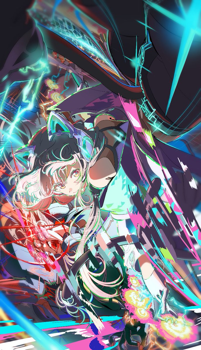 1girlanimal ear headphonesanimal earsbare shoulderscat ear headphonescat earsfake animal earsheadphonesholdingholding weaponlong hairlooking at viewermechanical earsmulticolored eyesneon lightssoloweapon