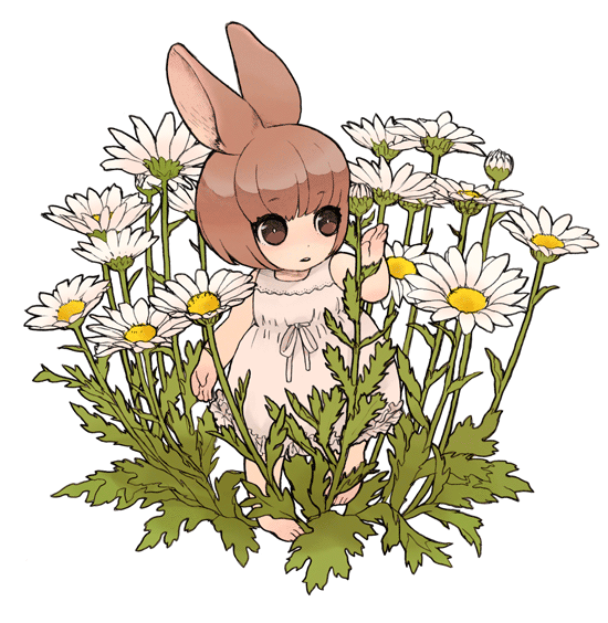 1girlanimal earsbarefootbrown eyesbrown hairfemale focusflowerpersonificationrabbit earsshort hairsolotransparent background