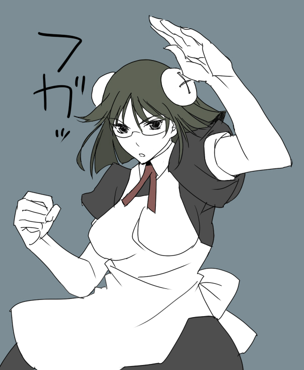 00s1girlapronarms upbun coverclenched handcowboy shotdressfemale focusfighting stanceglassesgreen hairlooking at viewermaidmaid apronmonochromered ribbonribbonshort hairsolospot color