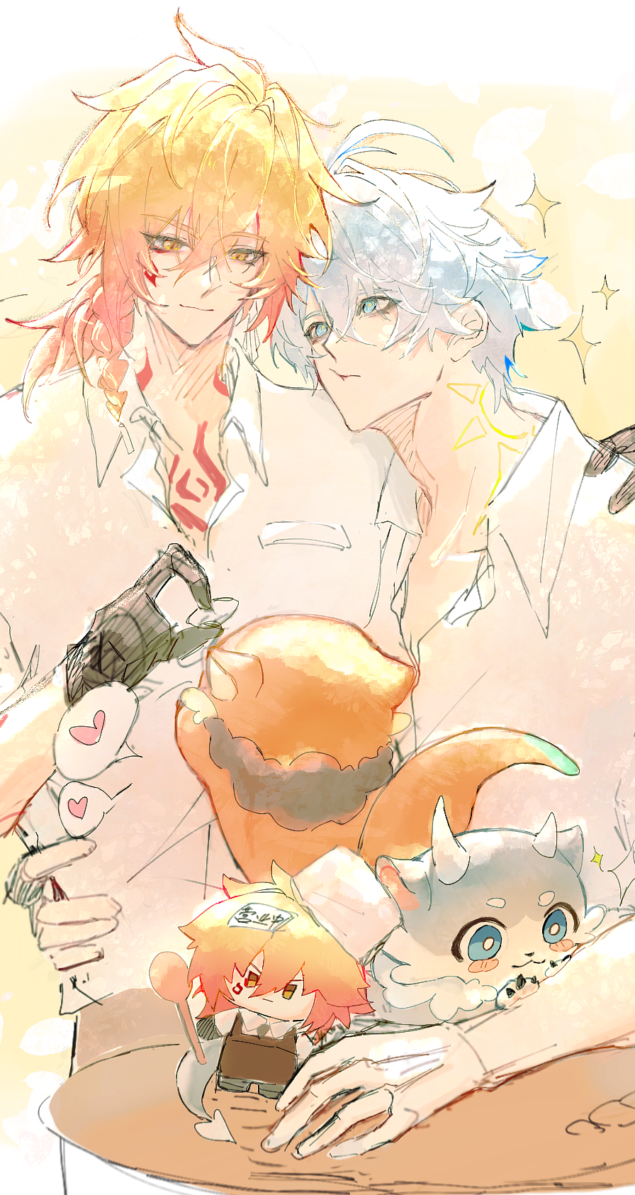 2boys3332997164antenna hairarm tattooblack glovesblonde hairblue eyesbraidcharacter dollchest tattoochimera (honkai: star rail)collared shirtdollfacial tattooglovesgradient hairhand on another's waistmale focusmedium hairmulticolored hairmultiple boysneck tattooparted bangsponytailred hairred tattooshirtshort hairside braidsun symbolsun tattootantattoowhite hairwhite shirtyaoiyellow eyes