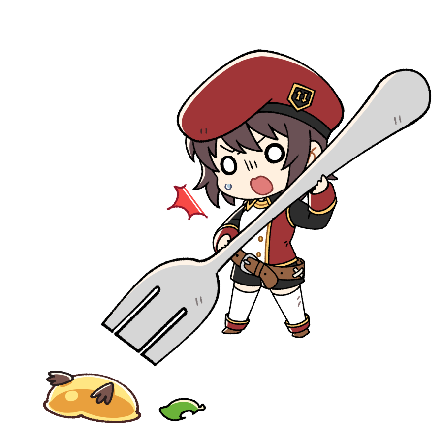1girlbeltbelt buckleberetbirdblack shortsblack sleevesbrown beltbrown hairbrown shoesbucklebuttonschibichibi onlyemblemflat colorgold buttonshatholdingholding sporkjacketjellyppi leafleaflegs apartloose beltmedium hairmulticolored jacketno noseno pupilsopen mouthoversized objectred hatred jacketshoesshortssidelightingsleeve cuffsslime (creature)solid circle eyessporkstandingsurprisedsweatdropthighhighstwo-tone jacketwhite eyeswhite jacketwhite thighhighswing collar