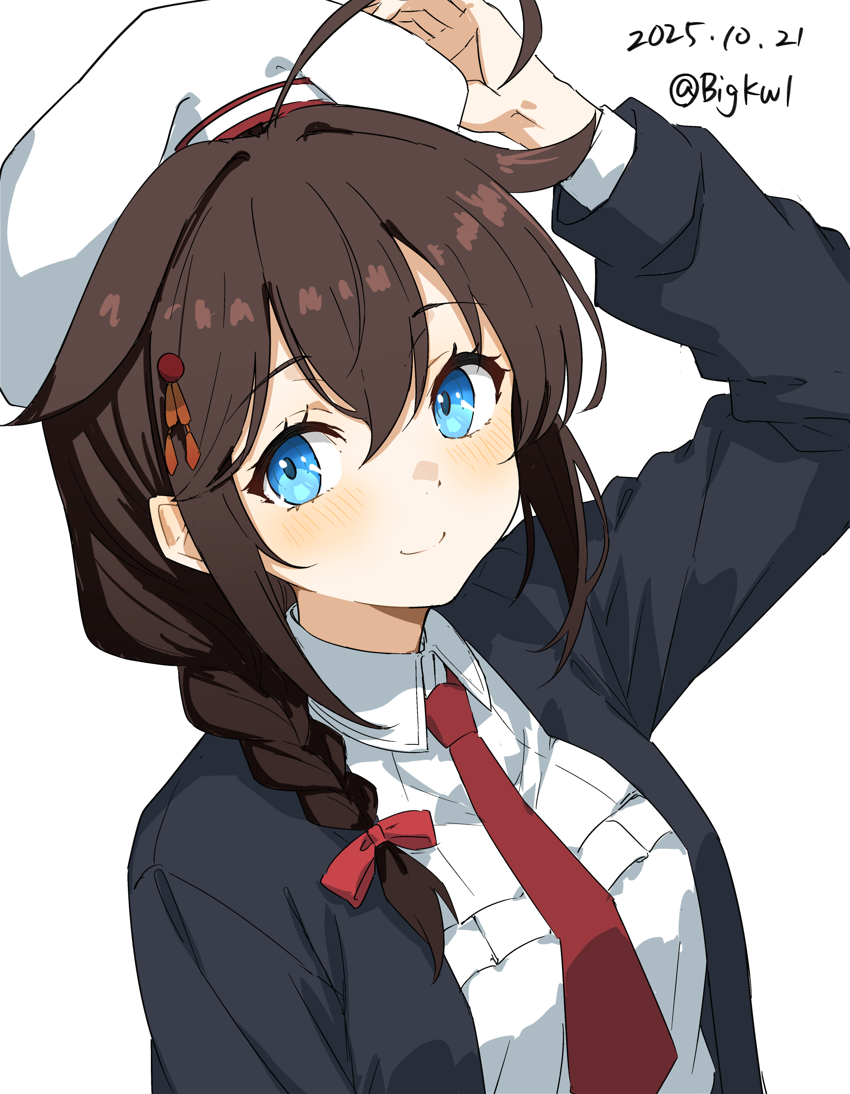 1girlahogeblack jacketblue eyesblushbraidbreastsdresshair flapshatjacketlong hairlooking at viewernecktieofficial alternate costumeone-hour drawing challengered necktiesingle braidsmilesolotwitter usernameupper bodywhite backgroundwhite dresswhite hat