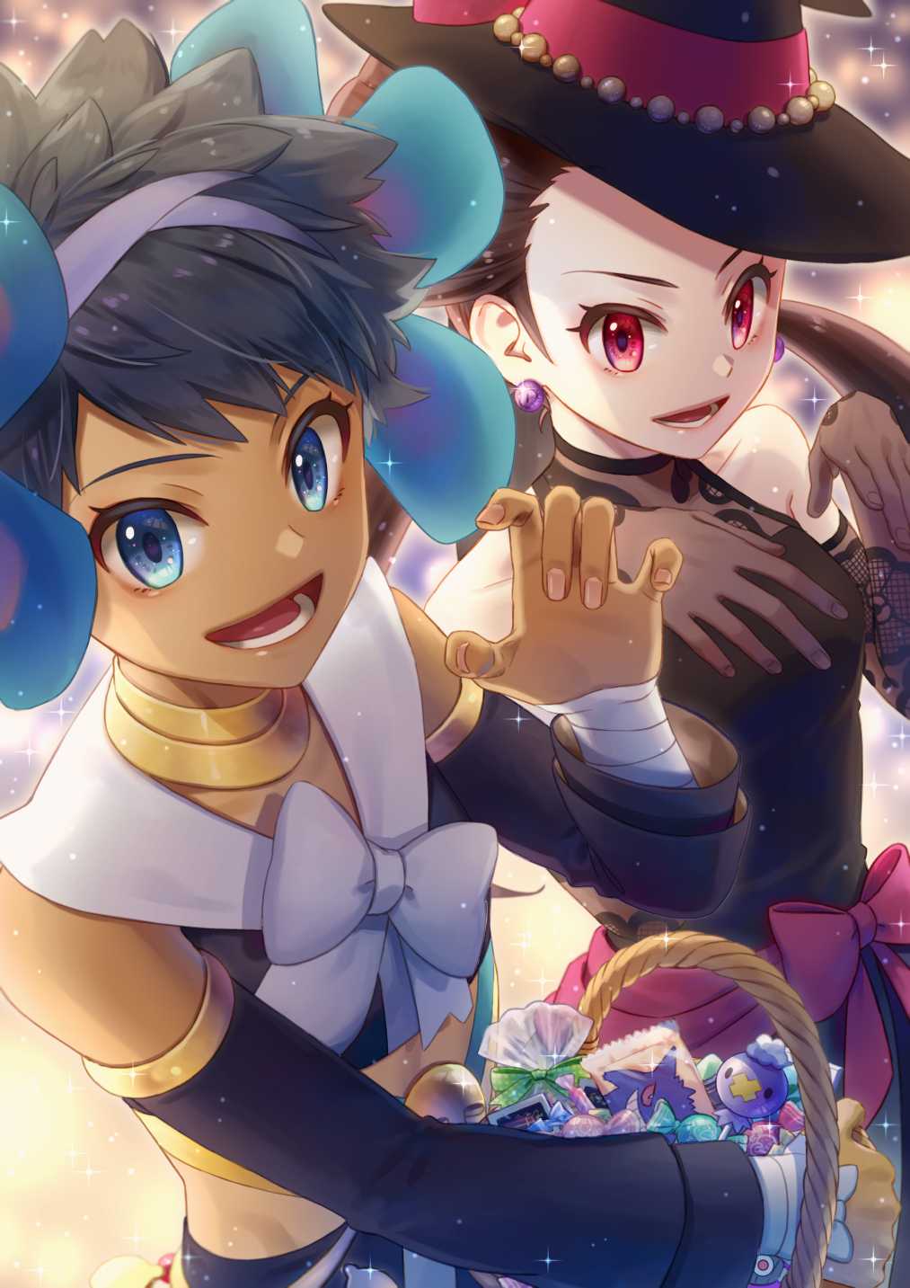 :d2girlsbasketblack hairblue eyesbowbrown hairdetached sleevesdressearringseyelashesgloveshair ornamenthalloween costumehand uphands uphathat ribbonjewelrylower teeth onlymultiple girlsofficial alternate costumeopen mouthpink eyesribbonshort hairsmilesparkleteethtonguewitch hat