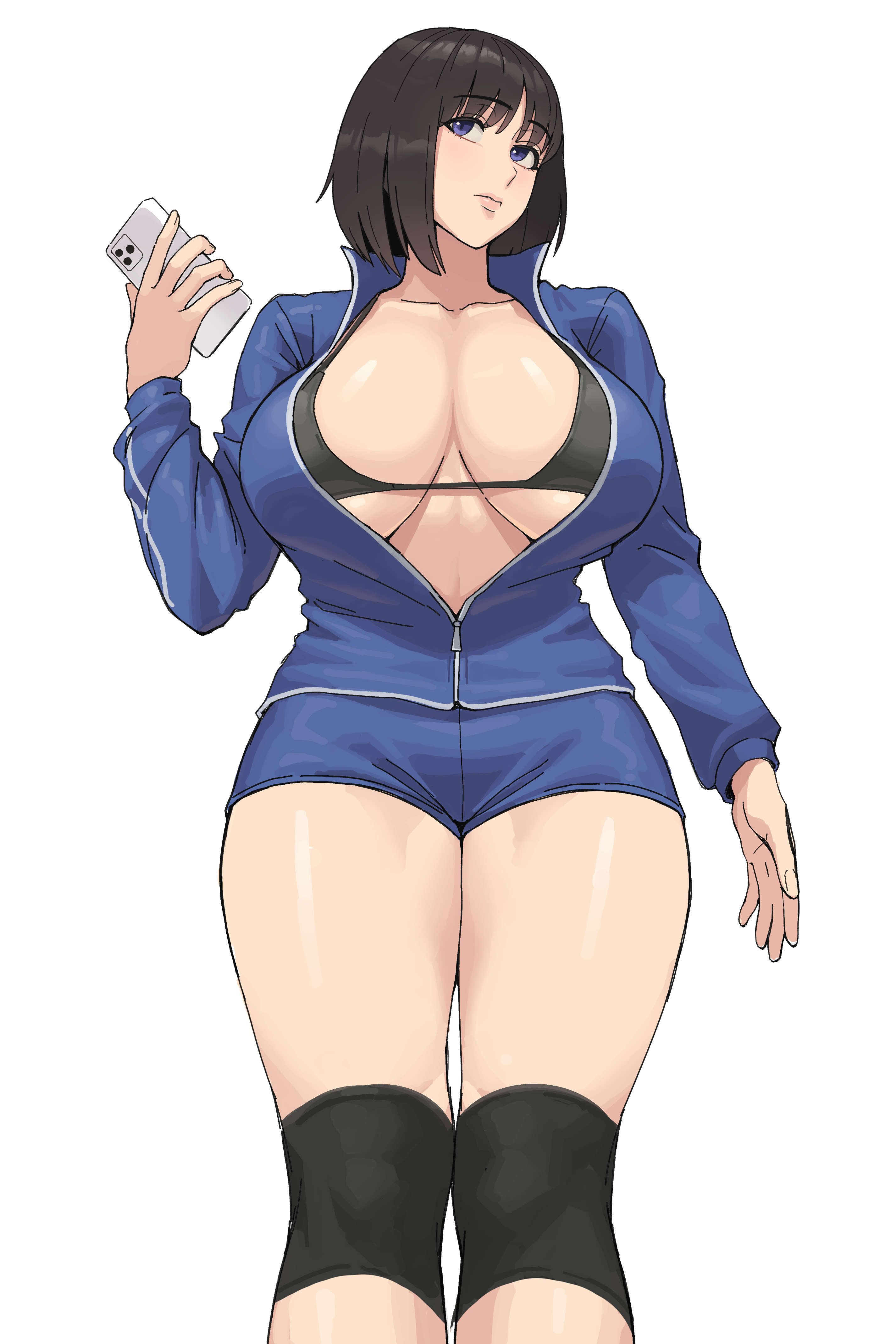 1girlblack hairblue eyesblue jacketblue shortsbreastscleavagecollarbonecurvygym shortsholdingholding phonejacketknee padslarge breastslooking to the sideopen clothesopen jacketpartially unzippedphoneshort hairshortssolothighstrack jacket