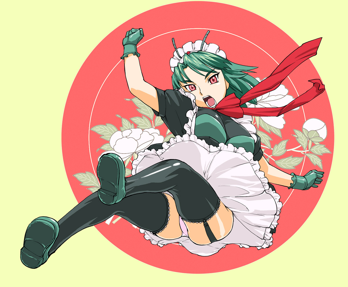 1girlapronfemale focusfull bodyhairbandkickingmaidmaid apronred eyesscarfskirtsolothighhighsupskirt