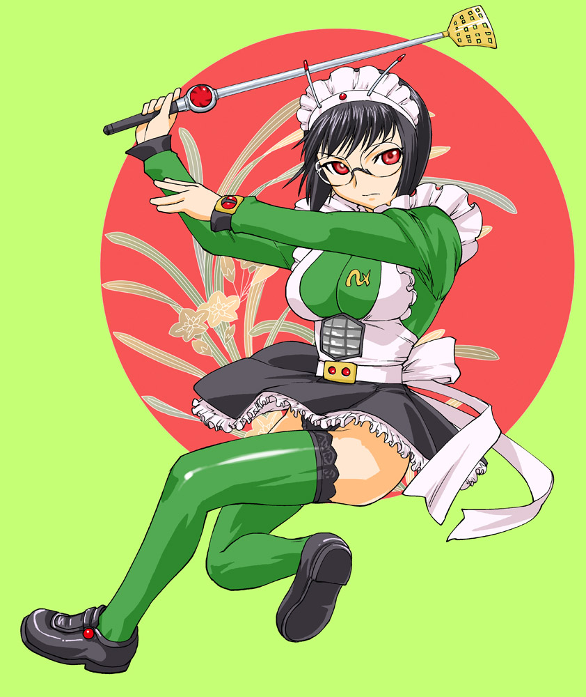 1girlapronbeltblack hairfemale focusfull bodygenderswapgenderswap (mtf)glasseshairbandmaidmaid apronminiskirtpantiespantyshotred eyesshort hairskirtsolothighhighsunderwearwindwind lift