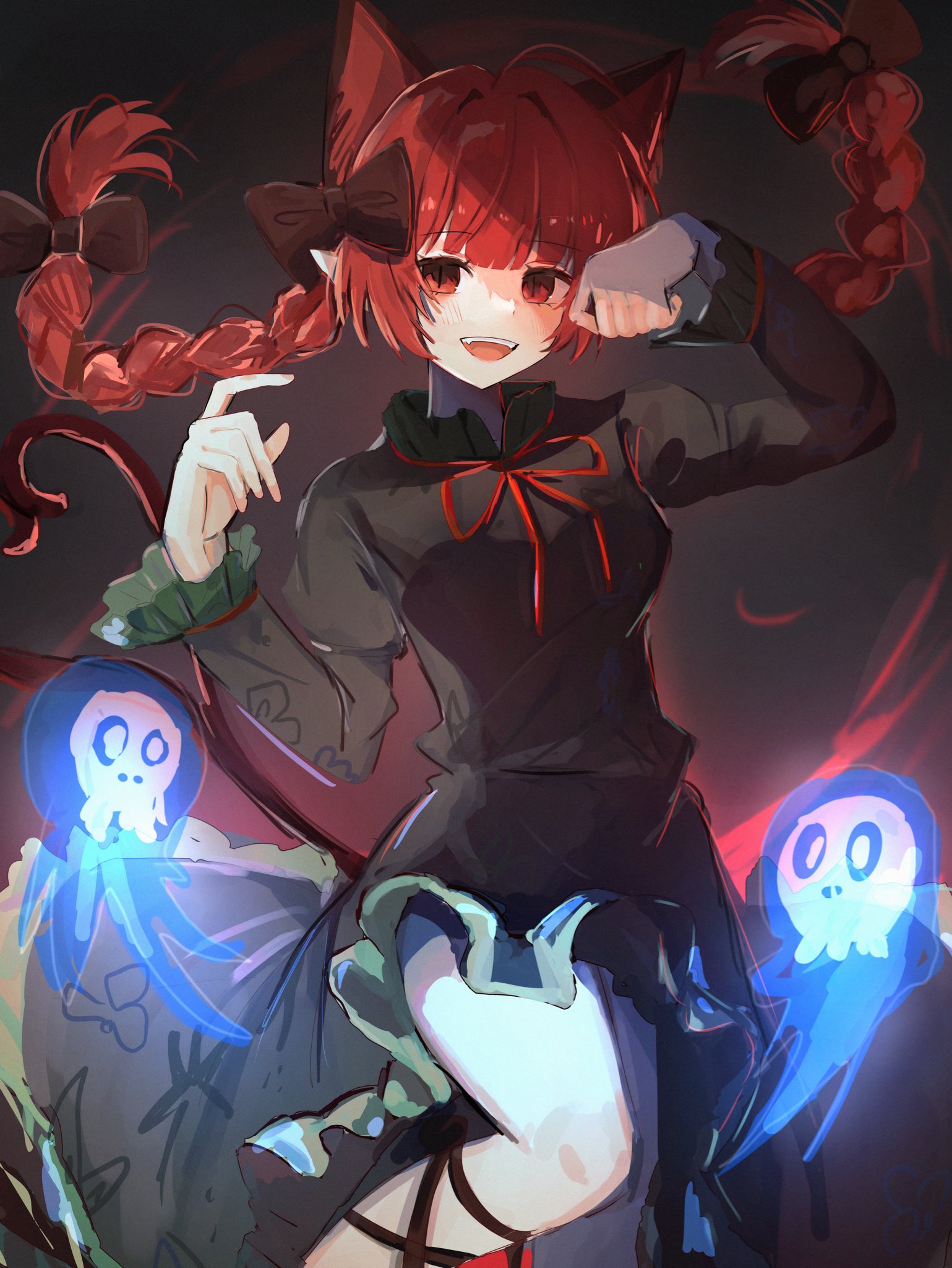 1girlanimal earsbowbraidcat earscat taildressextra earsfloating skullhair bowlong hairmultiple tailsnekomatared eyesred hairsolotailthird eyetwin braidstwo tailswheelbarrow