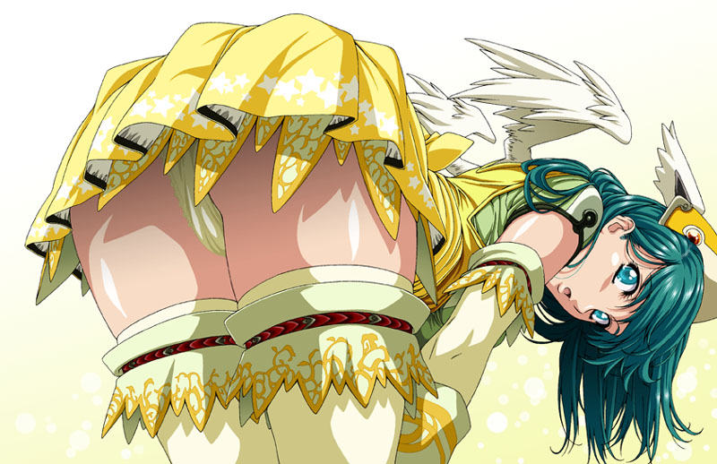 :oangel wingsaqua eyesassbent overcameltoedetached sleeveselbow glovesglovesgreen hairlooking backpantiespantyshotskirtsolothighhighsunderwearwings