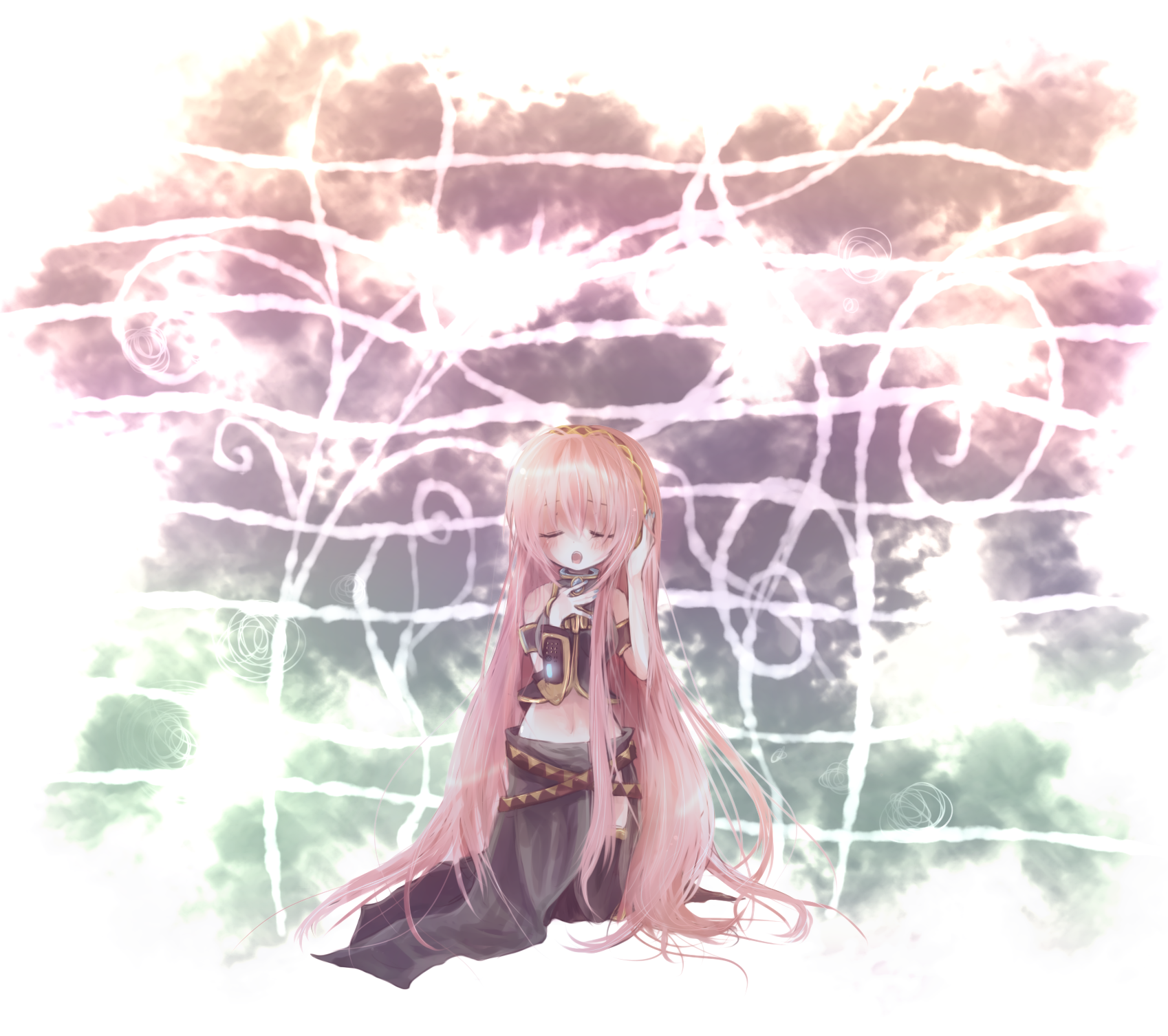 1girlarmbandclosed eyesfemale focuslong hairmidriffmusicnavelpink hairsingingsolovery long hair
