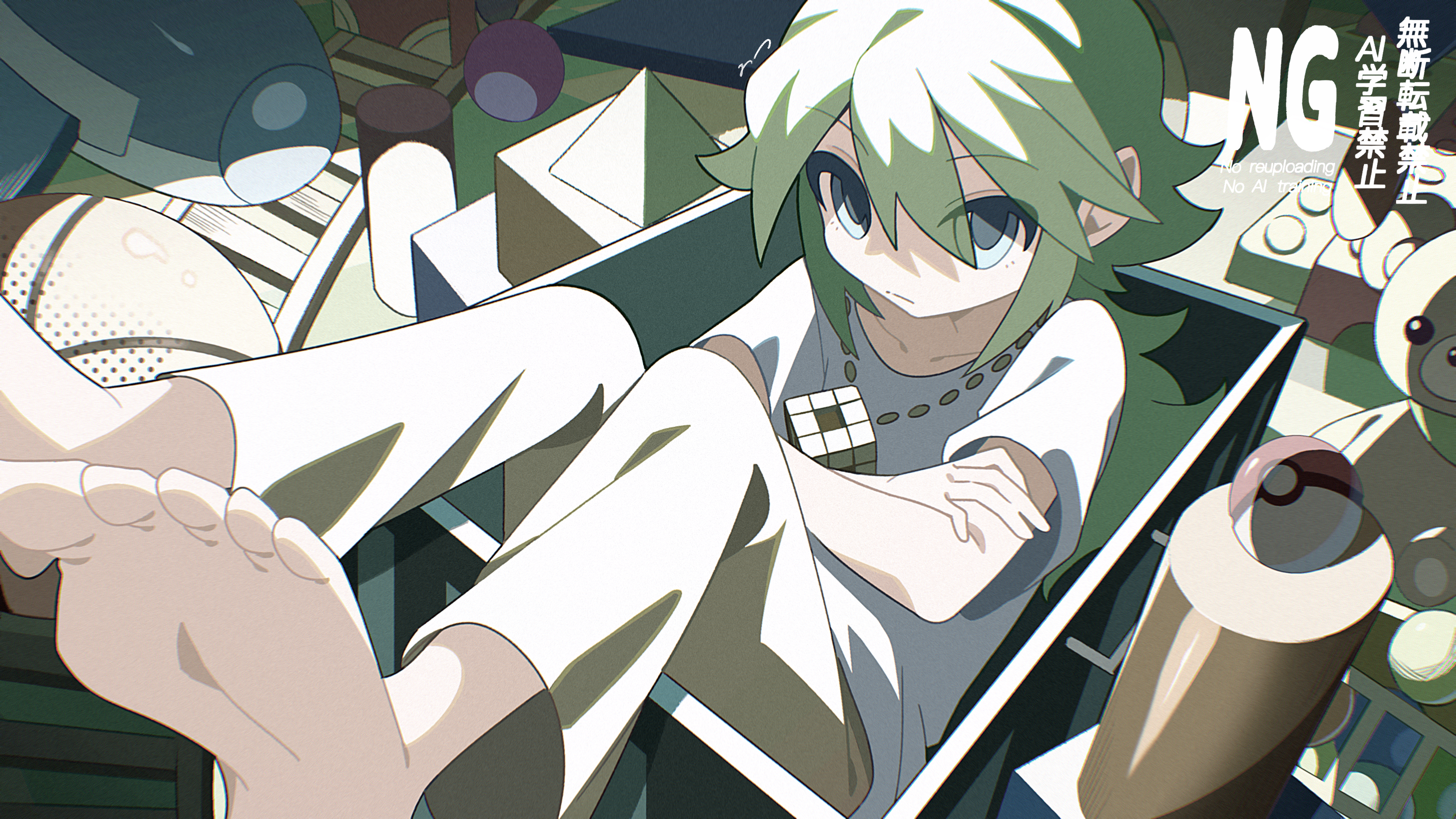 1boyaged downbarefootblue eyesboxclosed mouthcollarbonecrossed armsfeetgreen hairhair between eyesin boxin containerindoorsjewelrylong hairlooking upmale focusnecklacepantspoke ballpoke ball (basic)shirtshort sleevessolostuffed animalstuffed toyt-shirtteddy beartoestoy blockwatermark