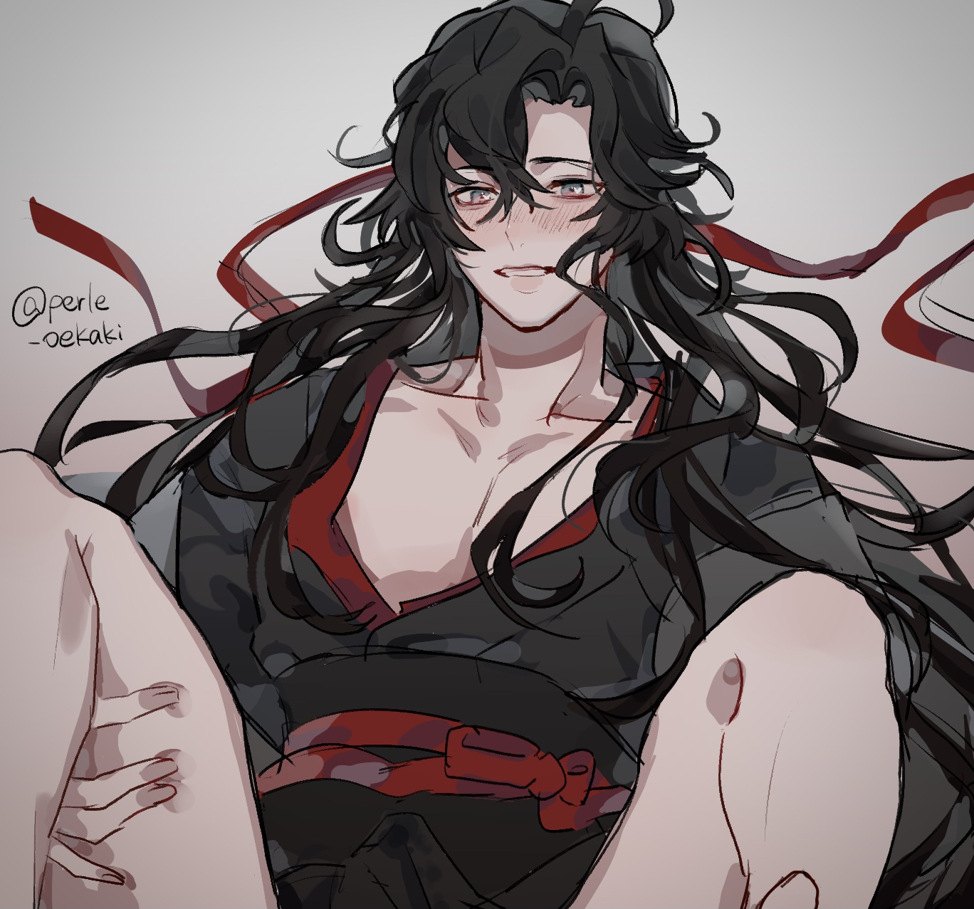 1boyahogebare legsbarefootbishounenblack hairblack hanfublack sashblushchinese clothescoatcollarbonegrey backgroundgrey coatgrey eyeshair between eyeshair downhair ribbonhalf updohanfuimplied seximplied yaoilong hairlooking at viewermale focusmessy hairoff shoulderofficial alternate costumeofficial alternate hairstyleopen clothesopen coatparted lipspectoral cleavagepectoralsred ribbonred sashribbonsashsimple backgroundsmilesolospread legstwitter usernamevery long hair