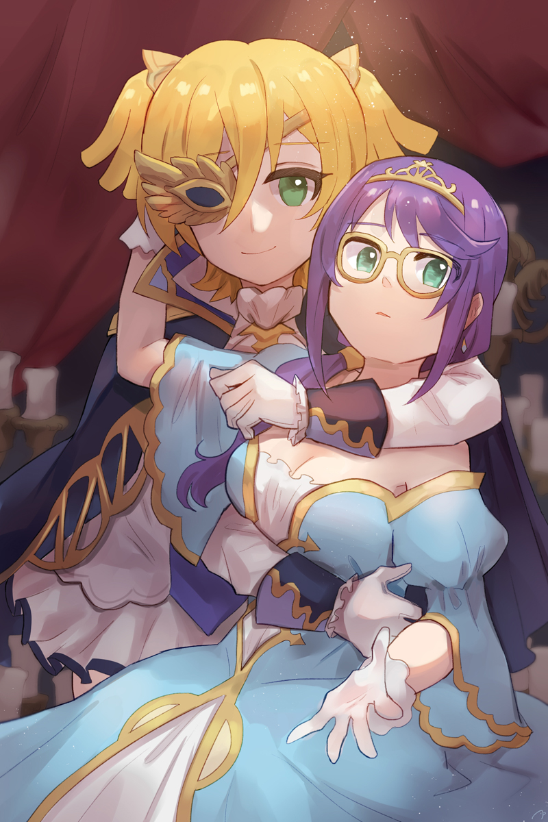 2girlsadapted costumearm around neckarm around waistarm uparmpit creaseascotbare shouldersblonde hairblue capeblue dressblue trimbreastscandlestandcapechristine daaechristine daae (cosplay)cleavageclosed mouthcollared capecosplaycowboy shotcurled fingerscurtainsdressepauletteserik (phantom of the opera) (cosplay)flipped bangsfrilled sleevesfrillsglassesglovesgold trimgreen eyeshair intakeshair over shoulderhalf maskhughug from behindjuliet sleeveslayered dresslight particleslong hairlong sleeveslooking at viewerlooking to the sidelow side ponytailmaskmedici collarmulticolored dressmultiple girlsofficial alternate costumeoutstretched handparted hairparted lipspleated skirtpuffy sleevespurple hairshort hairshort sleevessidelockssideways glanceskirtsleeve cuffssmiletiaratwo side upwhite ascotwhite dresswhite gloveswide sleevesyellow-framed eyewear