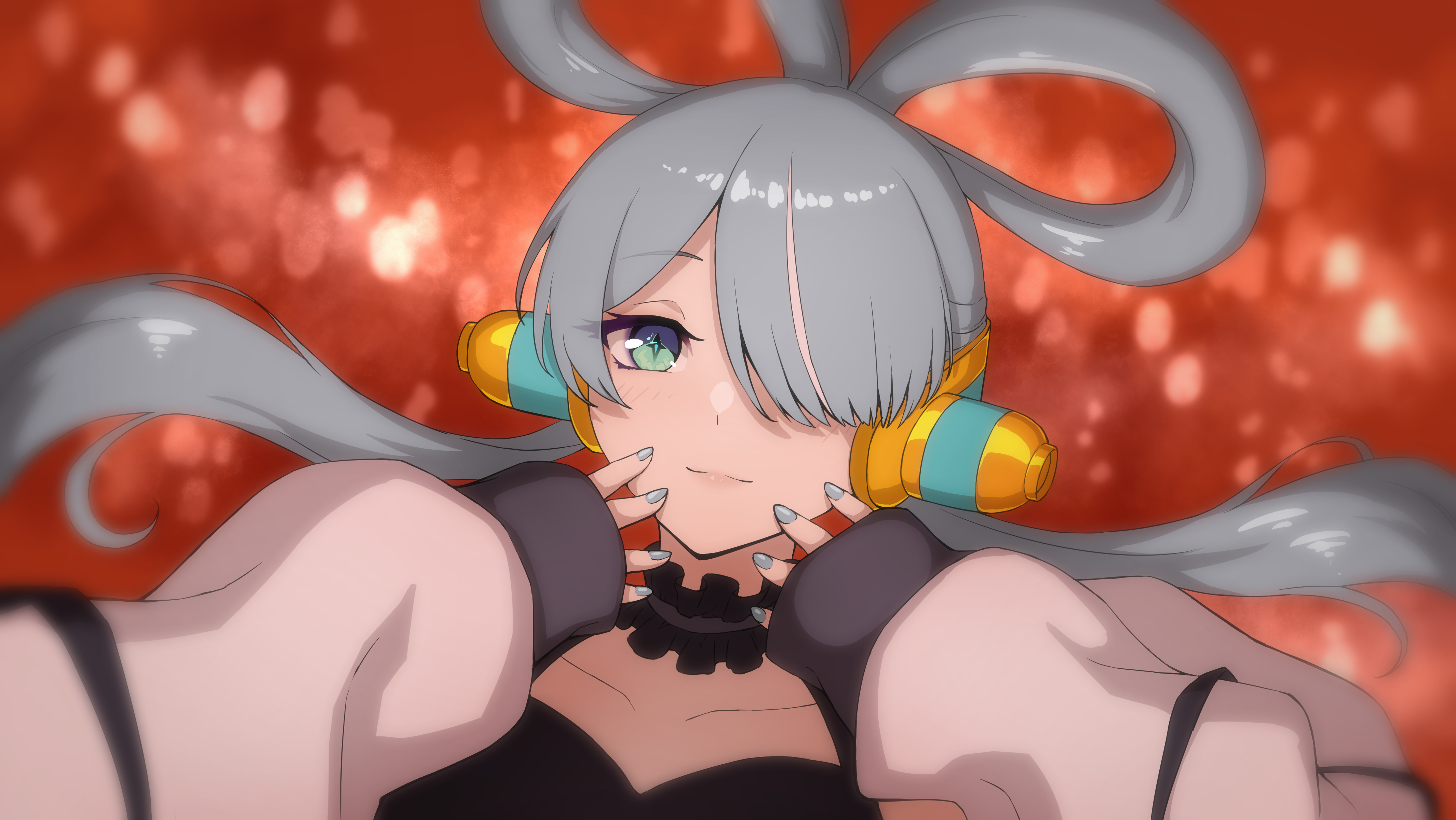 1girlaqua eyesblack chokerblue hairblue nailsblurryblushbokehbow-shaped hairchokercosplaycross-shaped pupilsdepth of fieldhair over one eyelight smilelong hairlong sleeveslooking at viewersleeves past wristssolosymbol-shaped pupilstwintailsuta (one piece) (cosplay)virtual youtuber