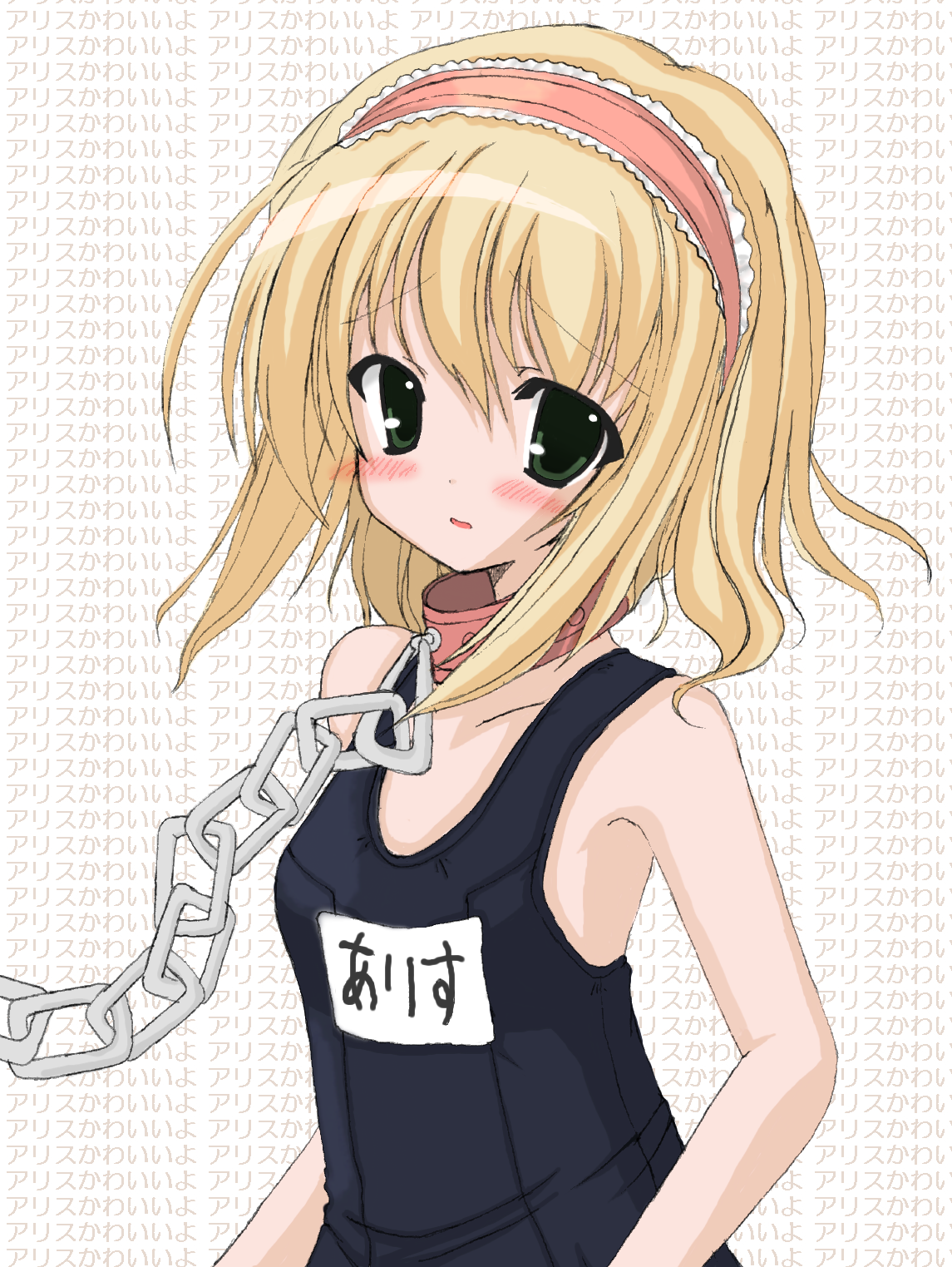 1girlblack one-piece swimsuitblonde hairblushchaincollarfemale focusgreen eyeshair ribbonname tagone-piece swimsuitribbonschool swimsuitshort hairsoloswimsuit
