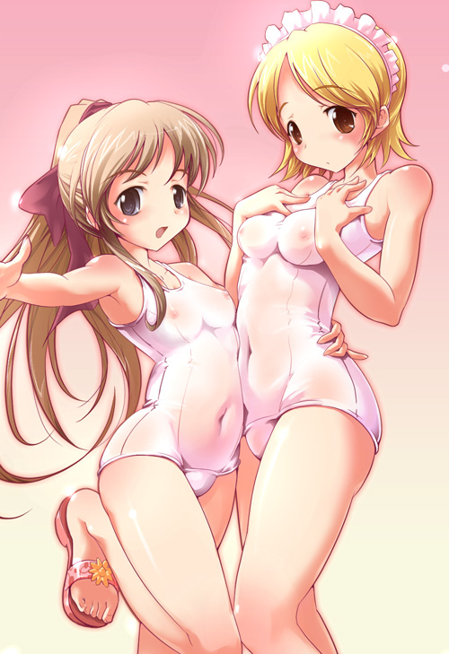 2girlsblonde hairblushbrown eyesbrown hairflat chestgrey eyeshugleg liftlegslong hairmaidmultiple girlsnipplesone-piece swimsuitponytailsandalsschool swimsuitsee-through clothesshort hairstandingswimsuitwhite one-piece swimsuitwhite school swimsuit