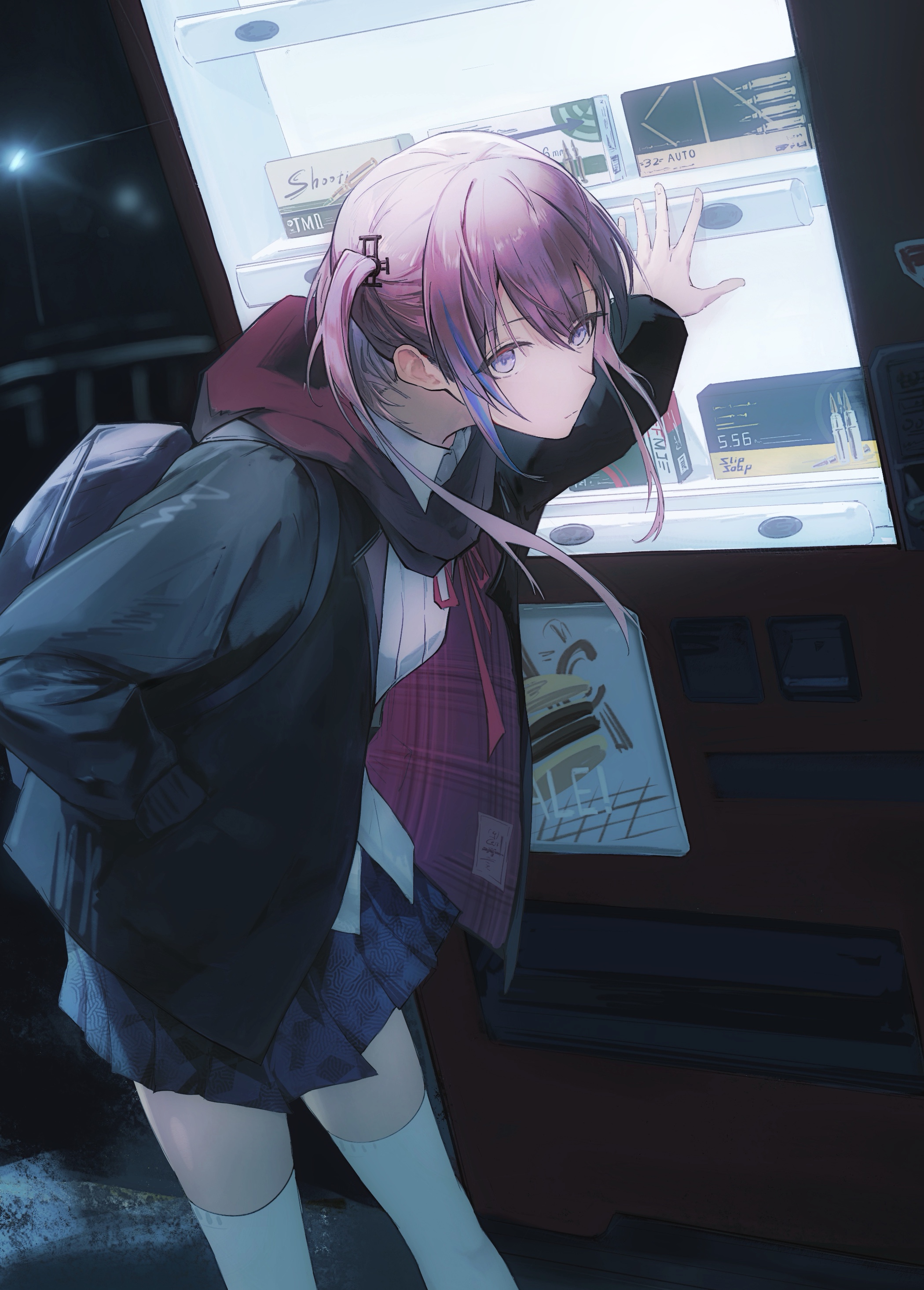 1girlbackpackbagblack jacketblue hairblue skirtclosed mouthhand in pocketjacketlong hairlooking at viewermulticolored hairofficial alternate costumeoutdoorspink hairpleated skirtpurple eyesskirtsolothighhighstwo-tone hairvending machinewhite thighhighs