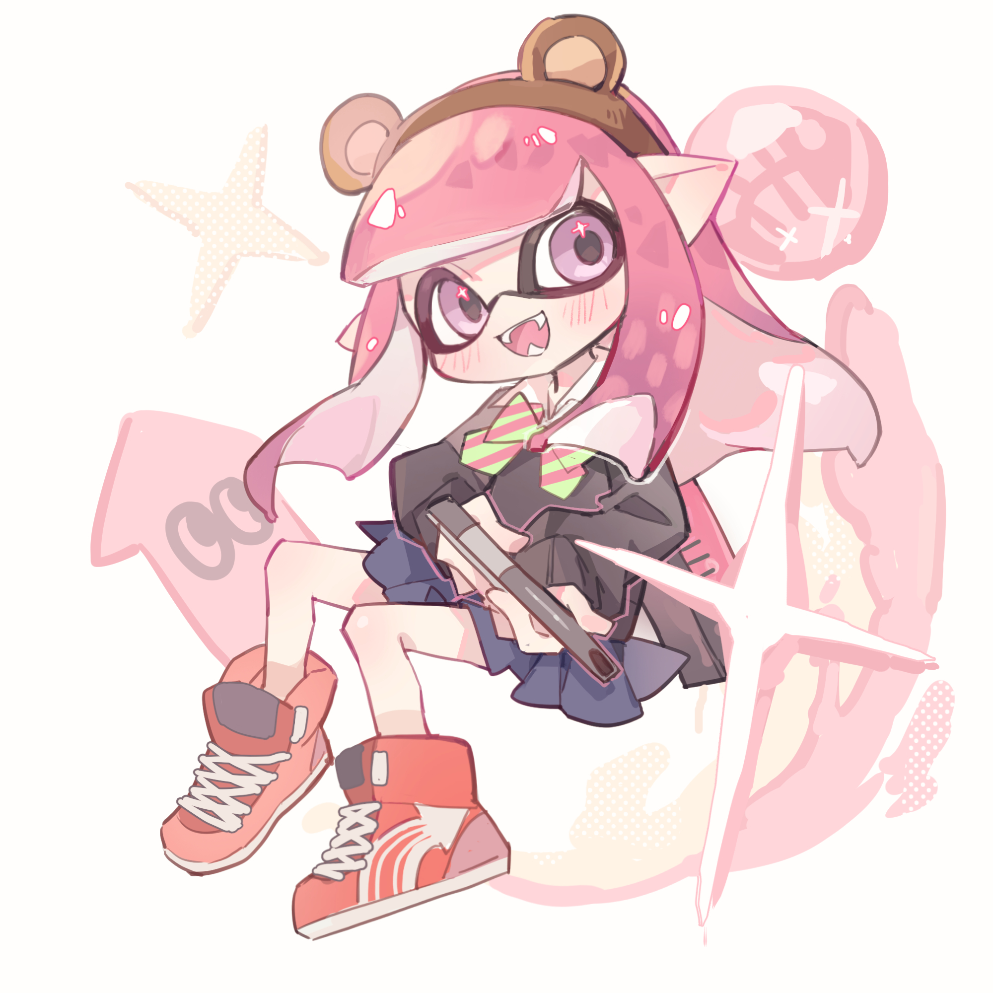 :d1girlanimal ear hairbandanimal earsbear ear hairbandbear earsblack shirtblue skirtblushbowbowtiebrown hairbandfake animal earsfangsfull bodygreen bowgreen bowtiehairbandink tank (splatoon)inklinglong hairlong sleeveslooking at viewern-zap (splatoon)open mouthpink eyespleated skirtpointy earsred shoesshirtshoesskirtsmilesneakerssolostriped bowstriped bowtiestriped clothestentacle hair