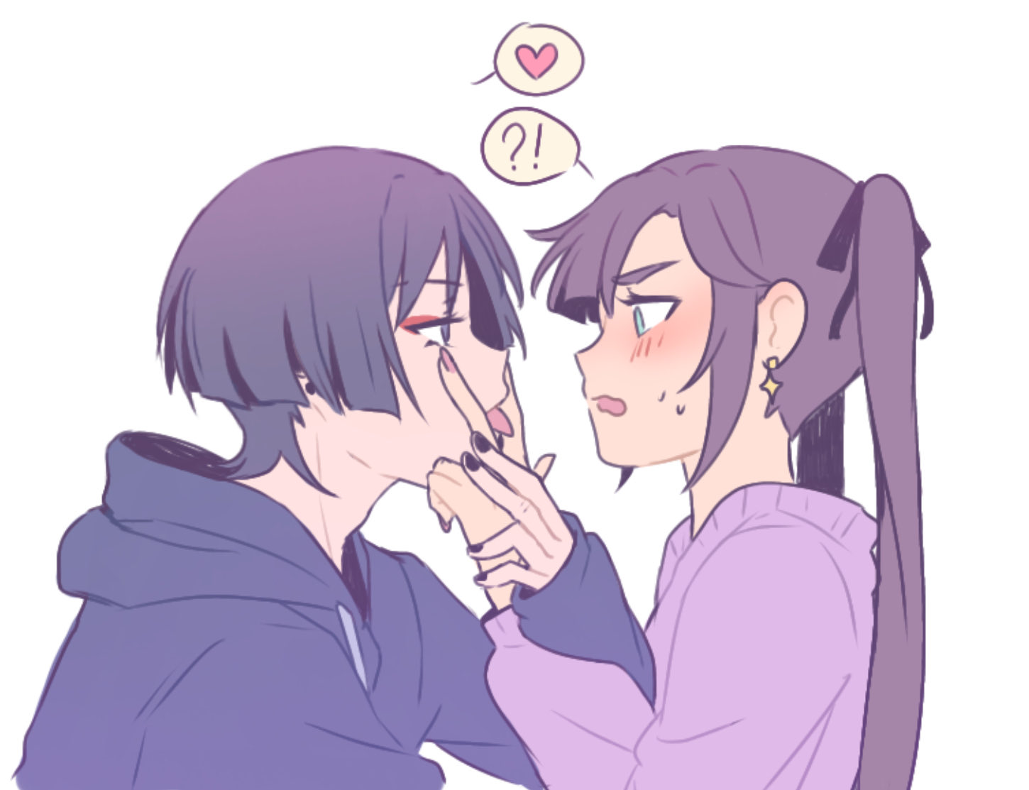 1boy1girlalternate costumeaqua eyesblack hairblack nailsblack ribbonblunt bangsblunt endsblushcasualcontemporarydrawstringearringsembarrassedeyelasheseyelinereyeshadowfrom sidegoldgold earringshair ribbonhand on another's facehand on another's handhand upheartheterohoodhood downhoodiejewelrylong hairlooking at anothermakeupopen mouthparted bangspink hairpink nailspink sleevespink sweaterprofilepurple hoodpurple hoodiered eyelinerred eyeshadowribbonsidelockssideways mouthspoken heartspoken interrobangstar (symbol)star earringssweatsweatertonguetongue between fingerstongue outtsurimetwintailswhite background
