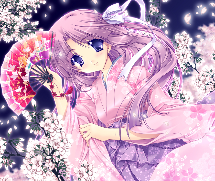1girlblue eyesblushcherry blossomsfemale focushair ribbonhand fanjapanese clotheskimonolong hairpink hairribbonsolo