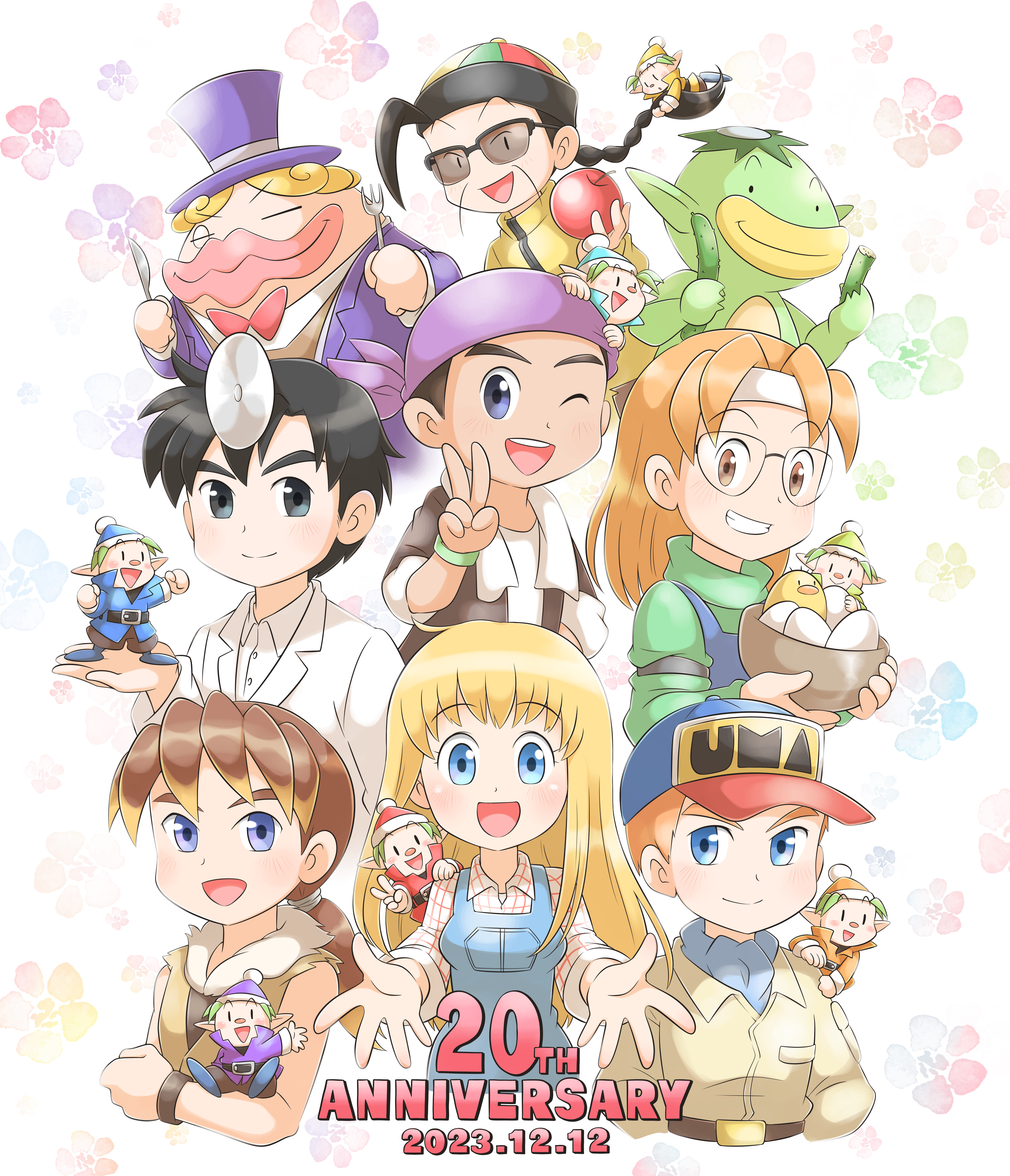 1girl6+boysanniversarybaseball capblack eyesblack hairblonde hairblue eyesblue overallsbokujou monogatari: mineral town no nakama tachi for garubraidbrown hairclosed mouthcucumberdark skindark-skinned maledateddoctordoctor (bokujou monogatari)eggglassesgrinhatkappalong hairlooking at viewermini personminiboymulticolored hairmultiple boysorange hairoverallsshort hairsize differencesmilev