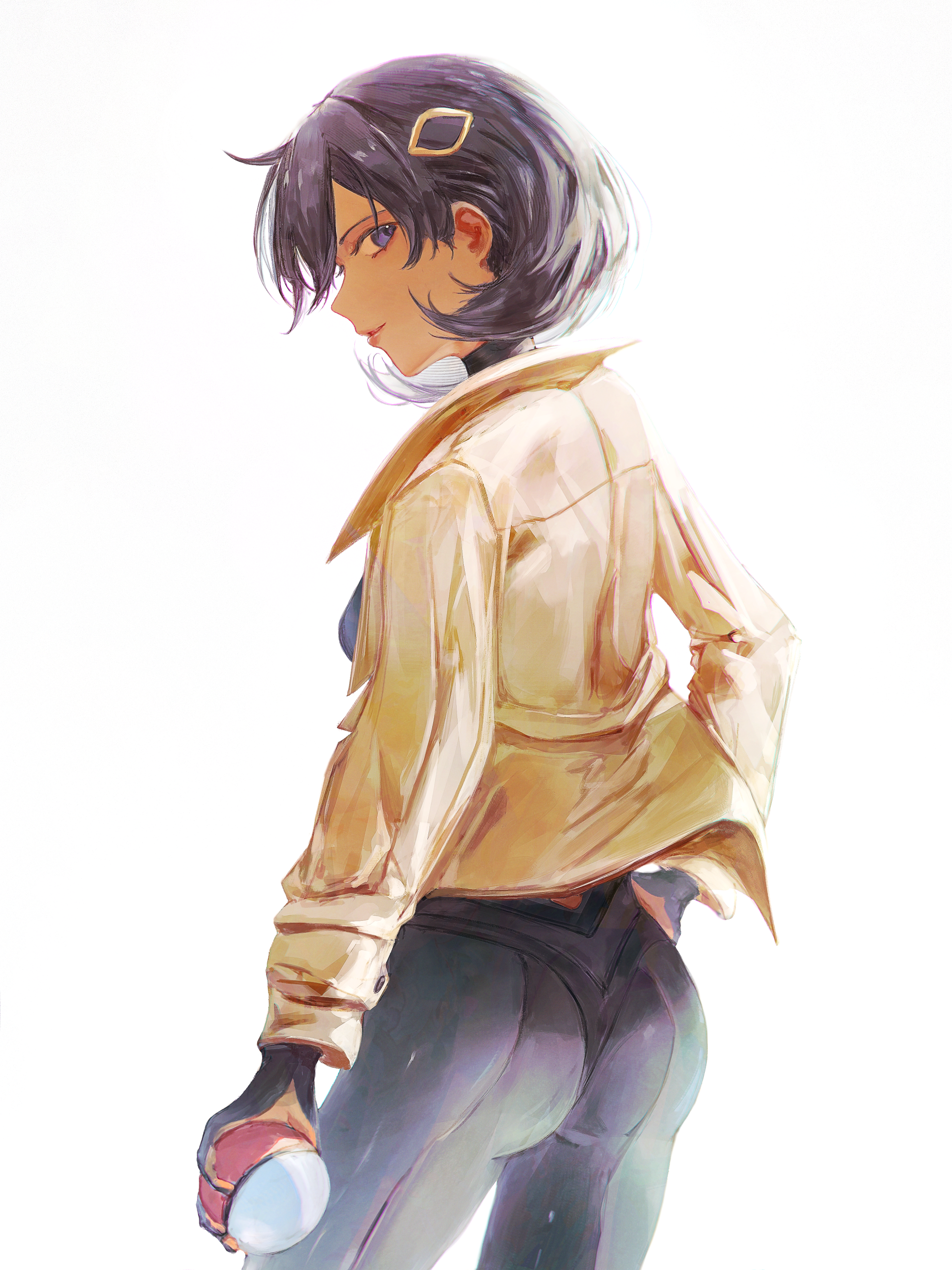 1girlassblack hairblue eyesbodysuitbodysuit under clothesclosed mouthcollared jacketgloveshair ornamentholdingholding poke balljacketlong sleeveslooking at viewerlooking backpoke ballpoke ball (basic)short hairsimple backgroundsolowhite backgroundyellow jacket