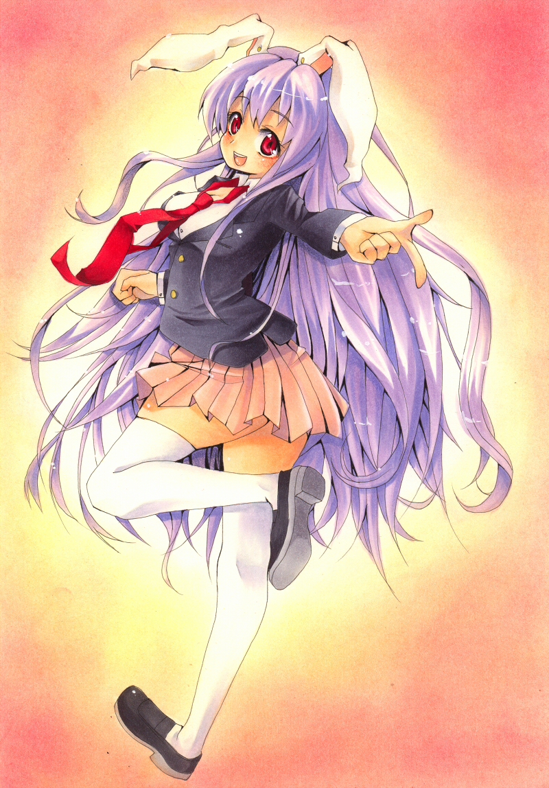 1girlanimal earsblazerfemale focusjacketloaferslong hairnecktiepleated skirtpurple hairrabbit earsred eyesred necktieshoesskirtsolothighhighsvery long hairwhite thighhighszettai ryouiki