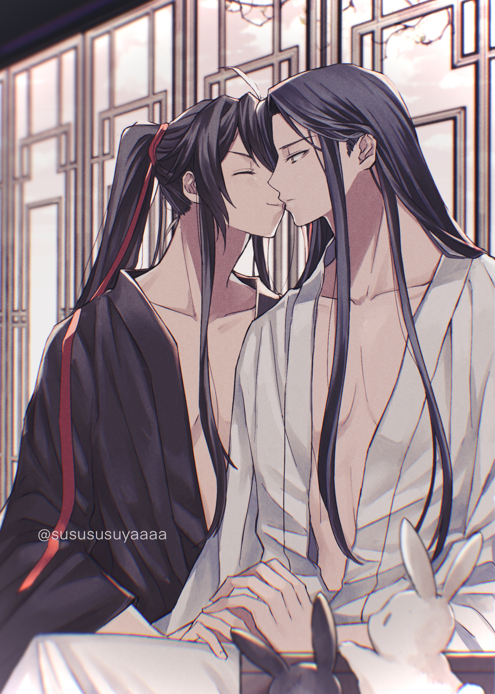 2boysahogeanimalbishounenblack hairblack hanfublack rabbit (animal)chinese clothesclosed eyesclosed mouthcollarbonecouplehair ribbonhanfuhigh ponytailholding handsimminent kissindoorskisslatticelong hairlong sleeveslooking at anothermale focusmultiple boysopen clothespectoral cleavagepectoralsponytailprofilerabbitred ribbonribbonrobesidelockssittingsmiletwitter usernamewhite hanfuwhite rabbit (animal)windowyaichi00yaoiyellow eyes