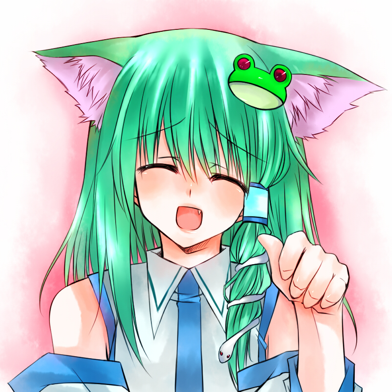 1girlanimal earsclosed eyesdetached sleevesfangfemale focusfroggradient backgroundgreen hairhair ornamenthead tiltkemonomimi modepaw posesnakesoloupper bodywhite background