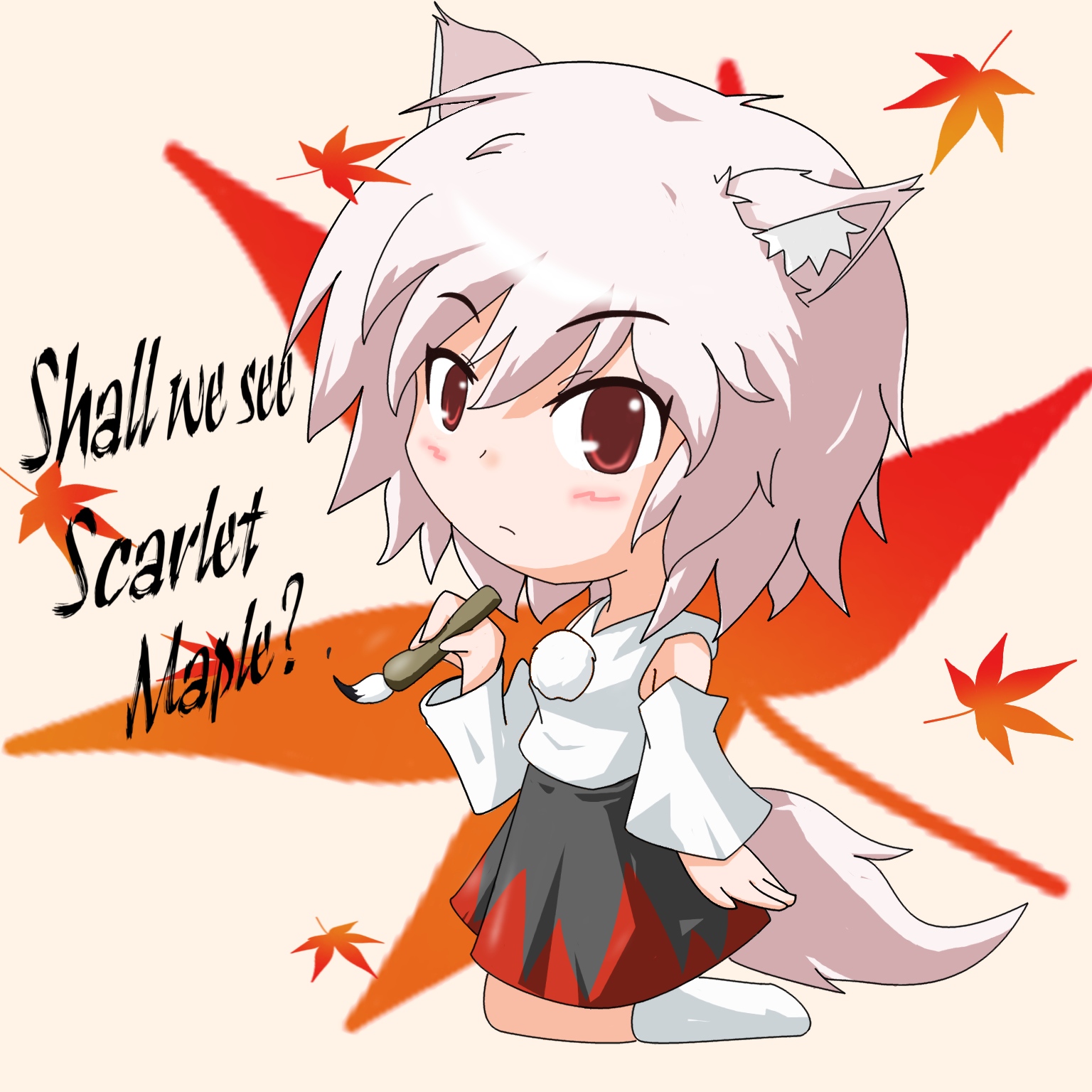 1girlanimal earscalligraphy brushchibidetached sleevesenglish textengrish textfemale focusfull bodykneelingleafpaintbrushplantranguagered eyesshort hairsolotailwhite hairwolf earswolf tail